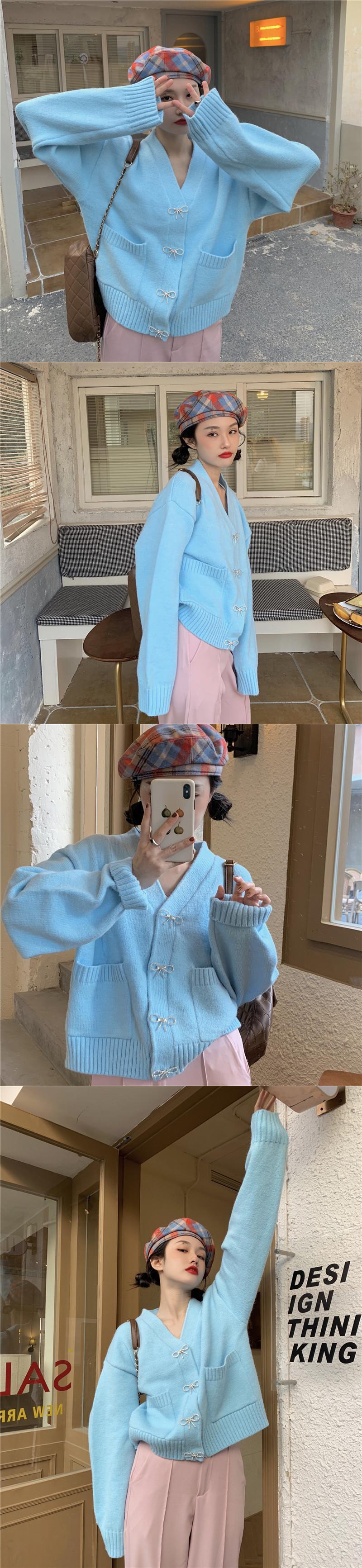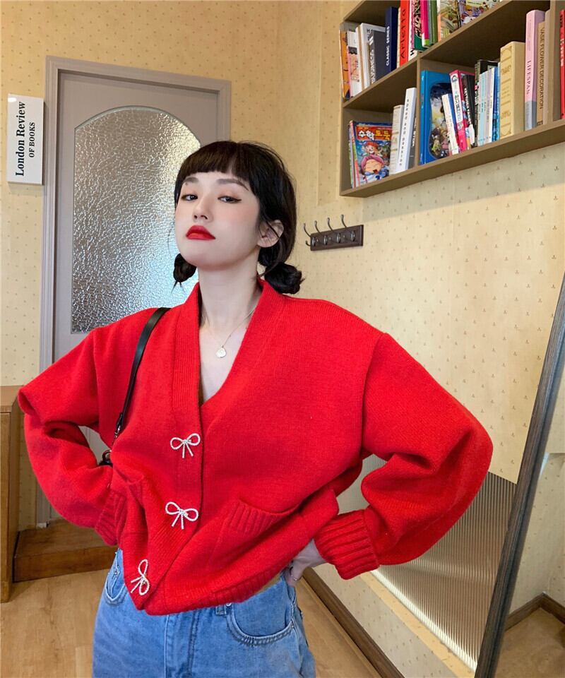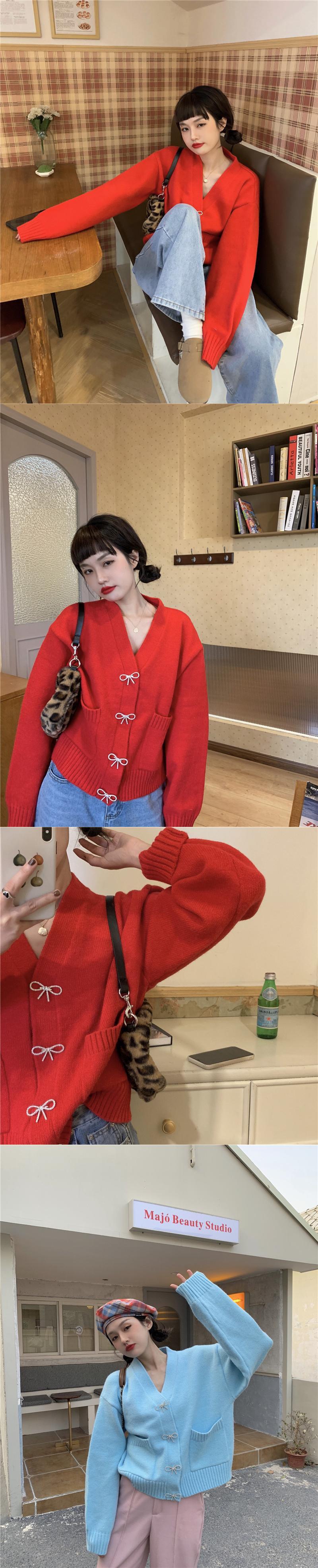 スプリングオータムリボンルーズVネックショートニットカーディガンセーター レディース ロング 大人ガーリー スウィート キュート カジュアル 春物 秋物 misskkl3727954768