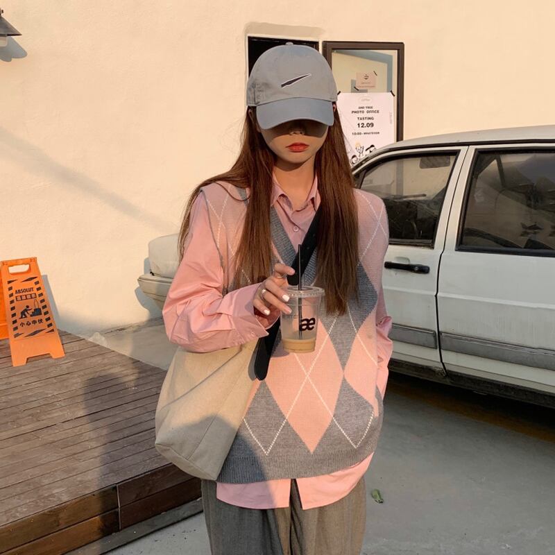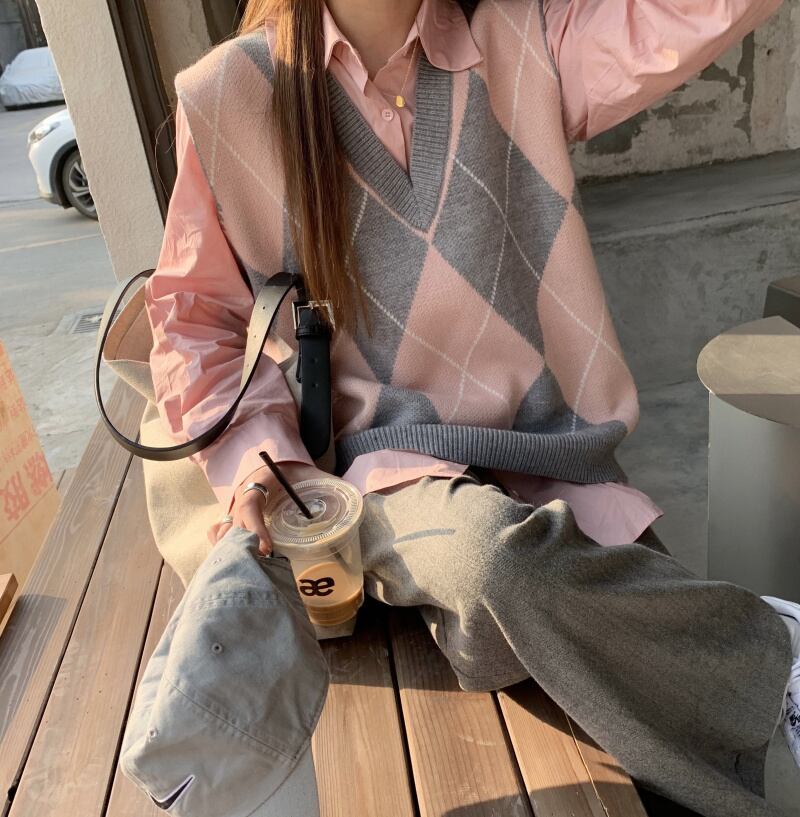 スプリングオータムスタイルカラー格子柄ルーズVネックニット 春物 秋物 misskkl99306870594