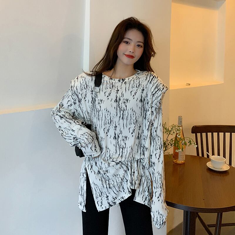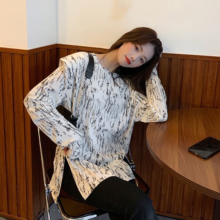 スプリングオータムスタンダードルーズプリントTシャツ トップス レディース ロング レトロ 春物 秋物 misskkl758035797