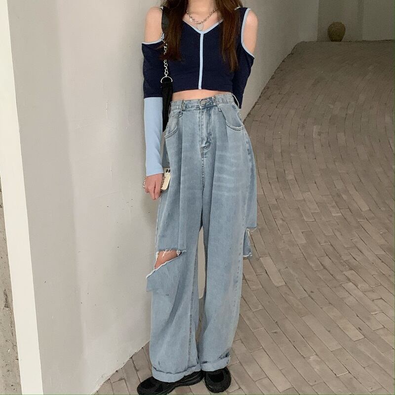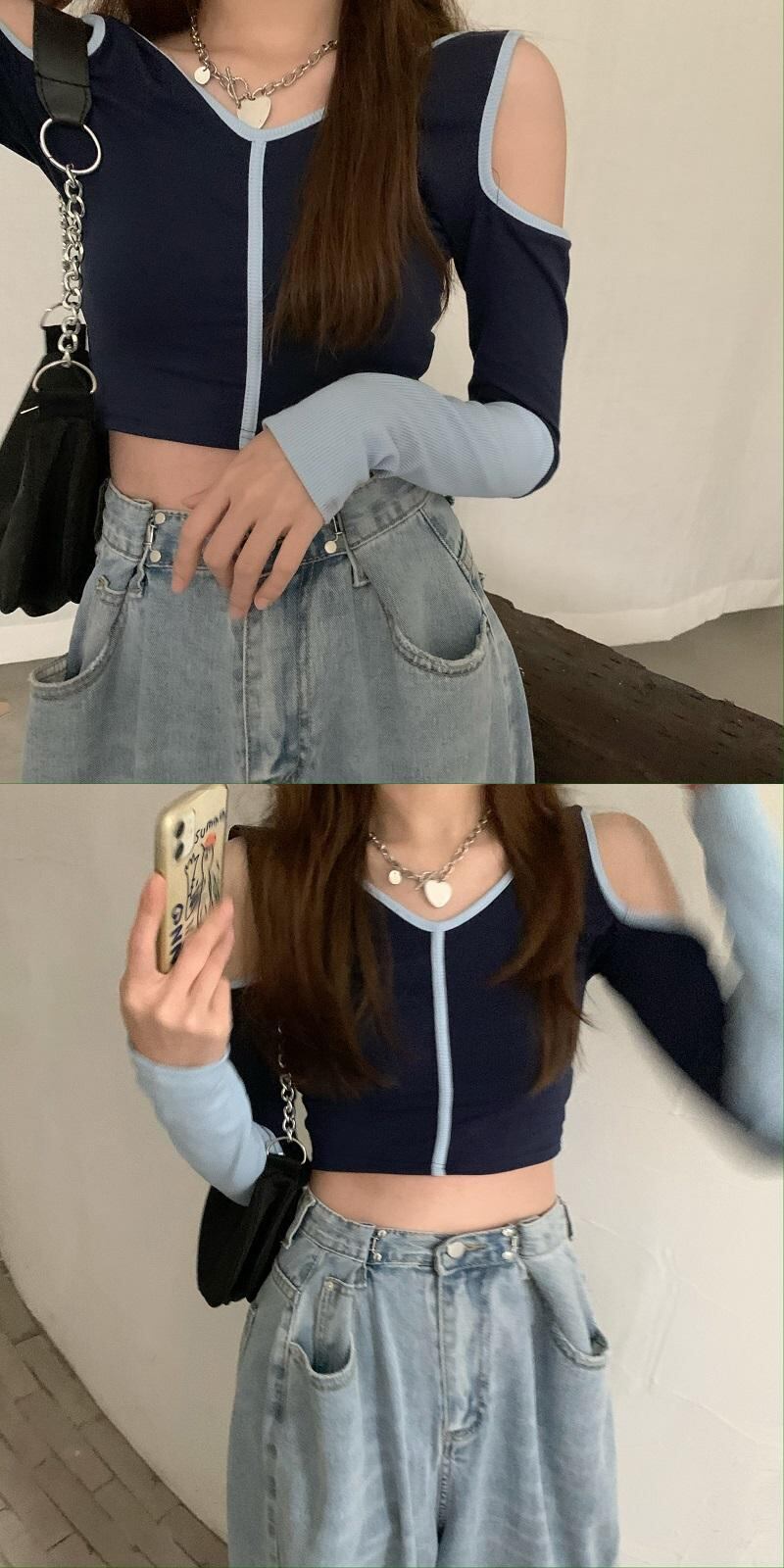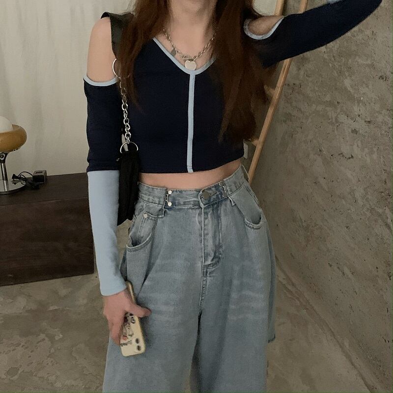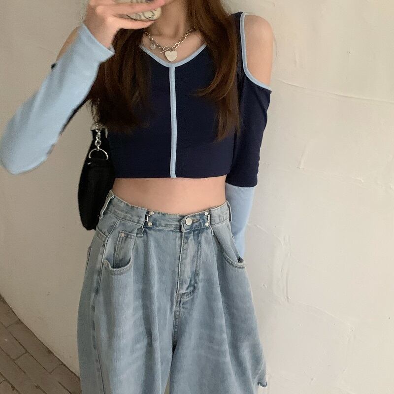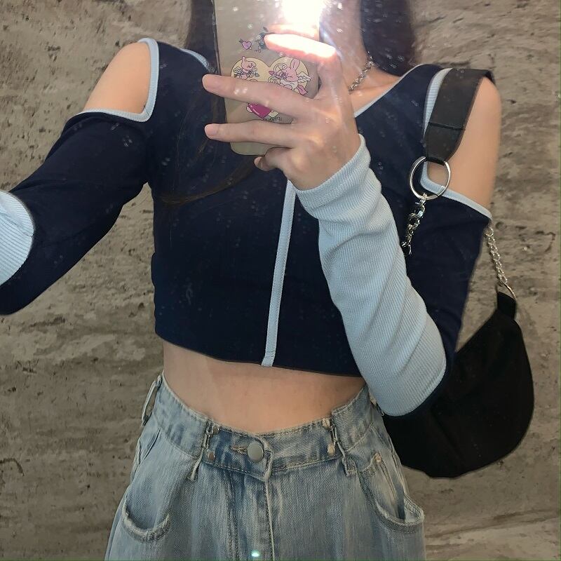 スプリングオータムスタンダードストラップレスVネックショートスリムTシャツ トップス ロング レトロ 春物 秋物 ステッチ misskkl42645791033