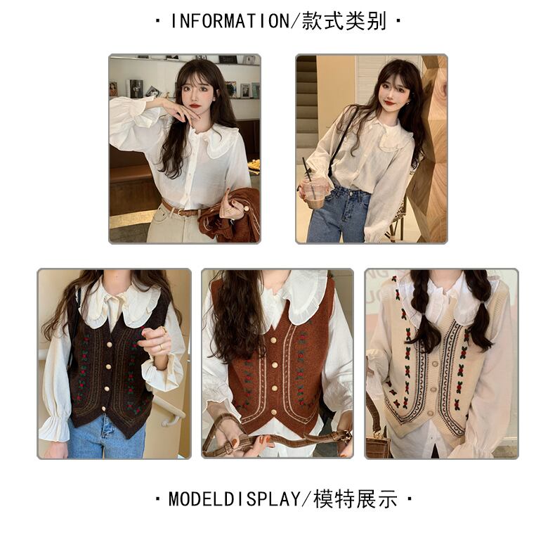色:ダークコーヒーベスト,ベージュのベスト,ダークレッドのベスト,白いシャツのワンピース,ワンピースアプリコットシャツ