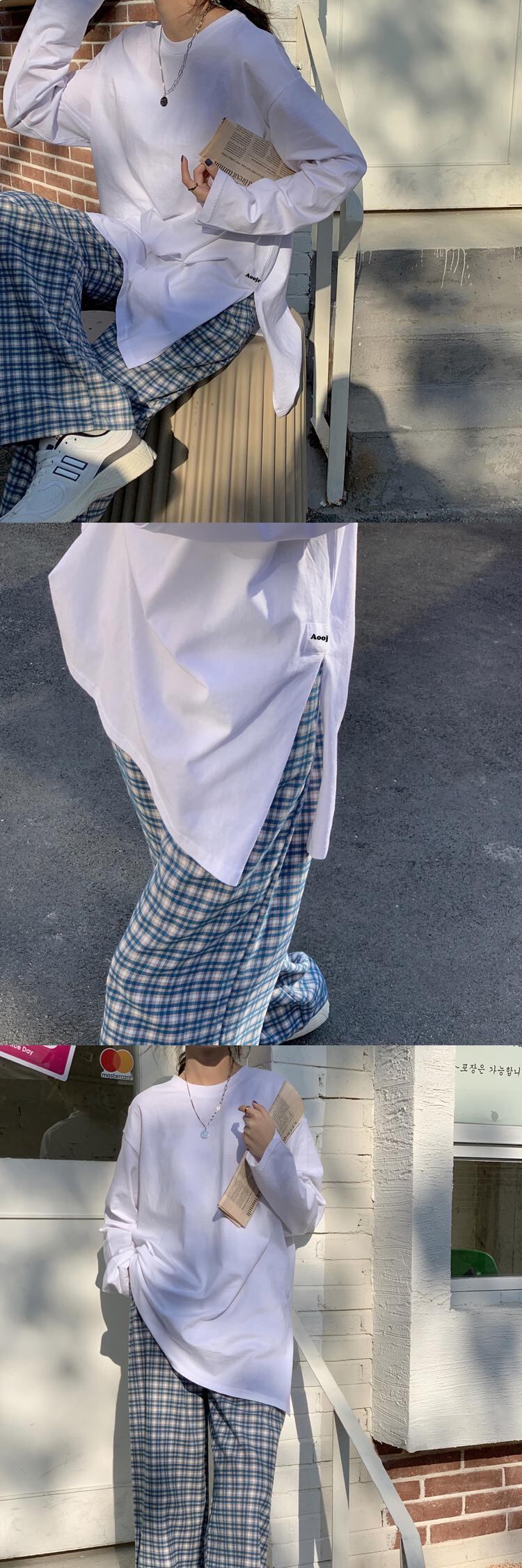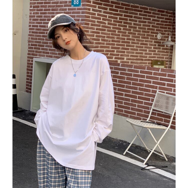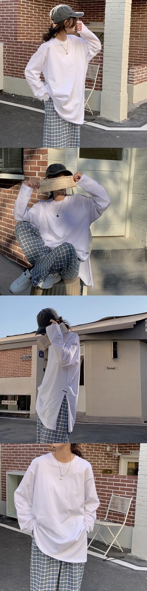 スプリングルーズサイドスリットソリッド カラーラウンドネックTシャツ トップス レディース ロング 春物 Oネック ソリッドカラー misskkl89297579085
