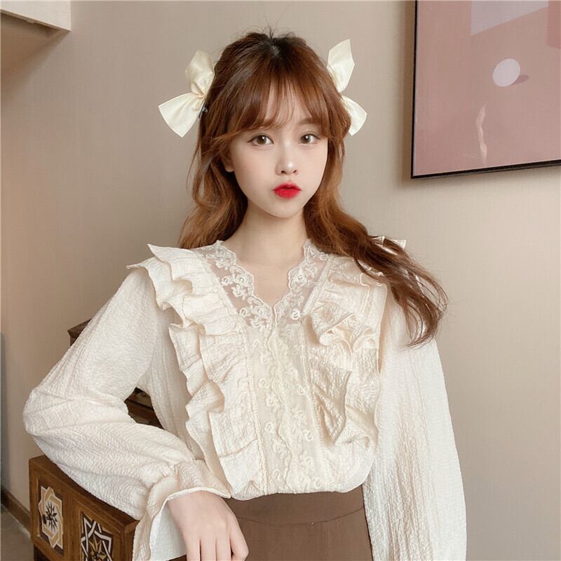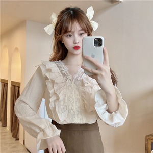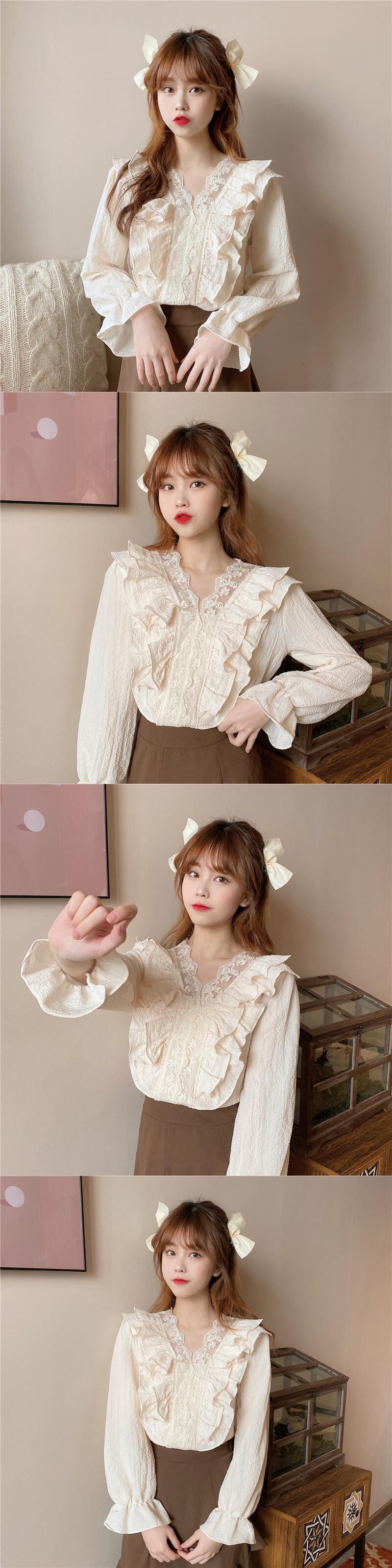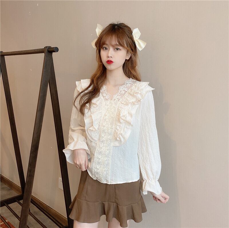 スプリングオータムスタンダードVネックレースルーズシャツ トップス レディーススタイル ロング レトロ 春物 秋物 ステッチ misskkl14928090192