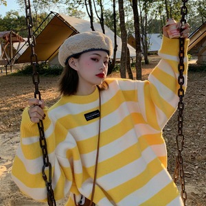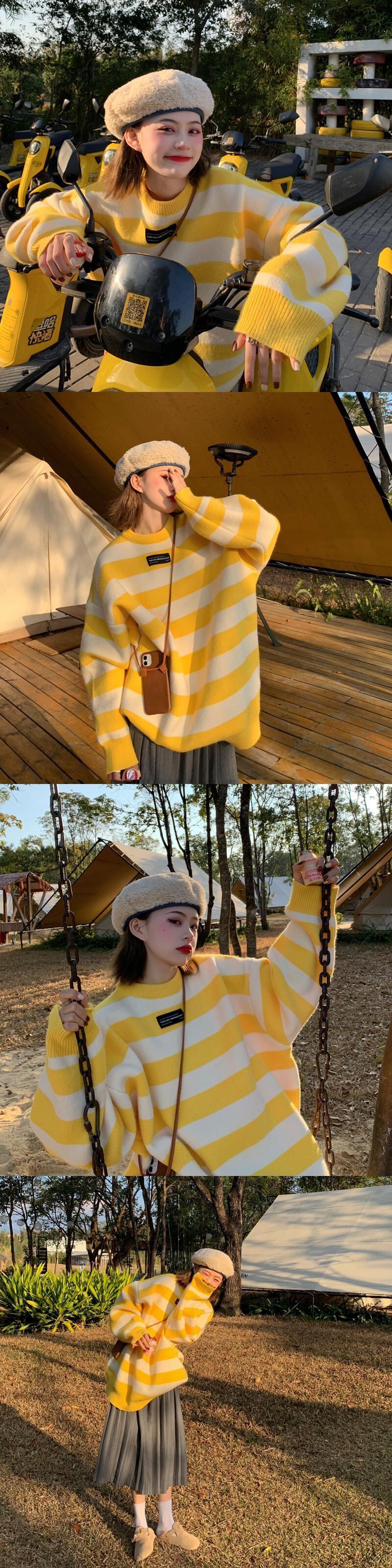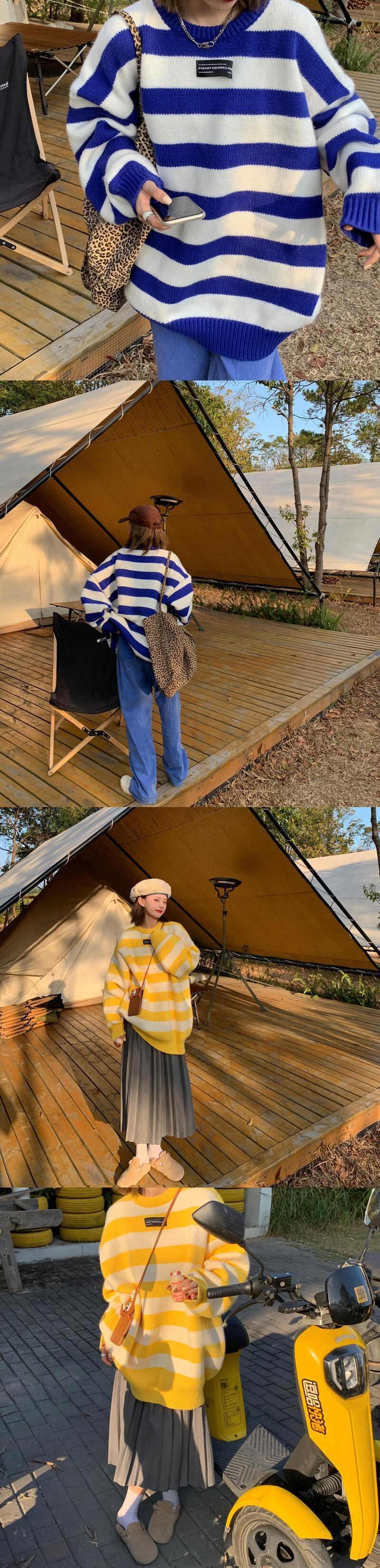 スプリングオータムルーズストライプラウンドネックニットセーター レディース ロング 春物 秋物 Oネック misskkl24474243096
