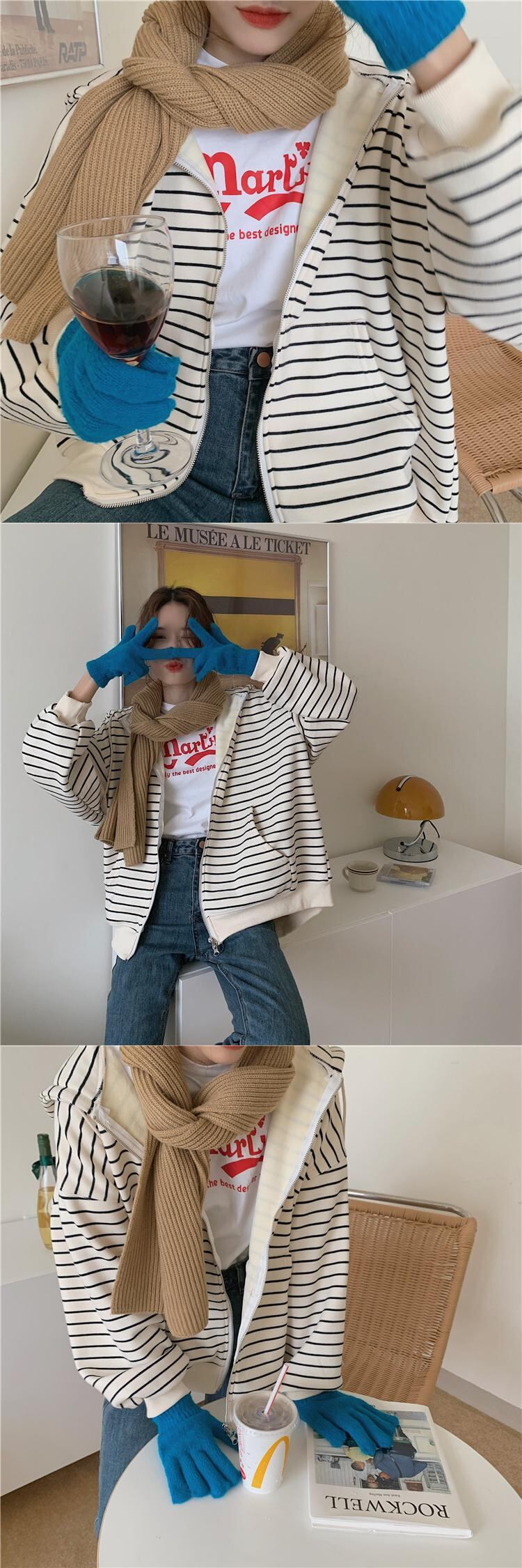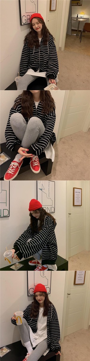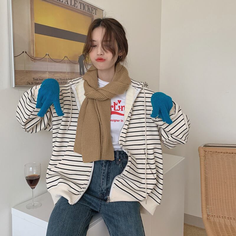 スプリングオータムフードルーズストライプカジュアルセーター ジャケット レディース ロング 春物 秋物 misskkl61132463024