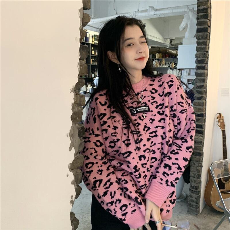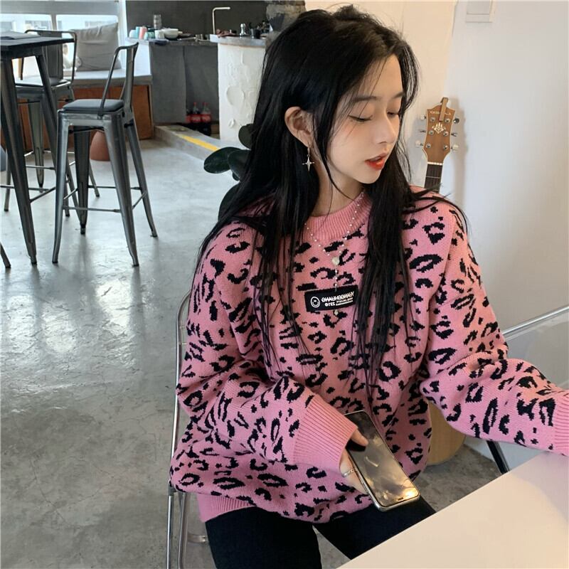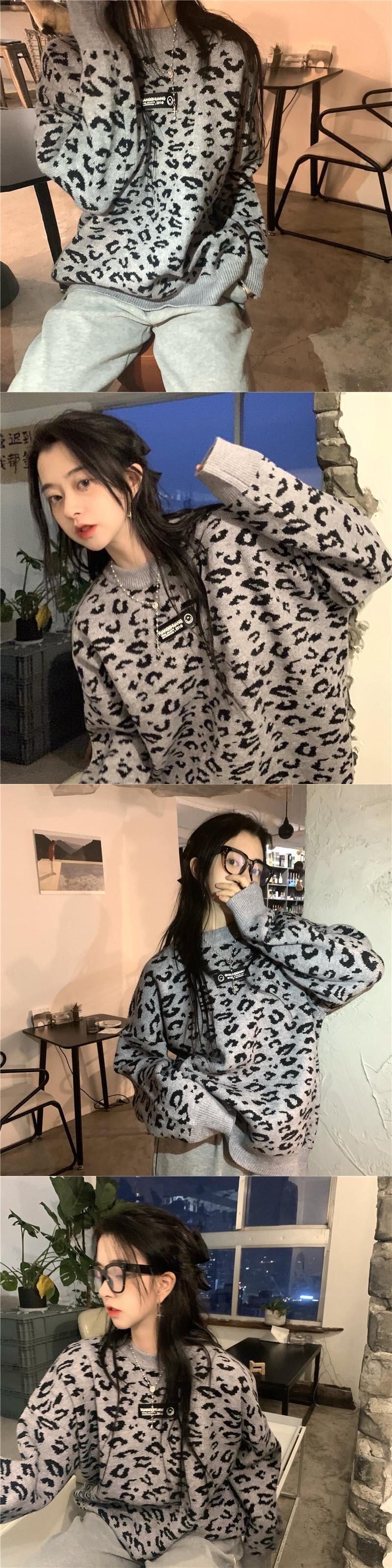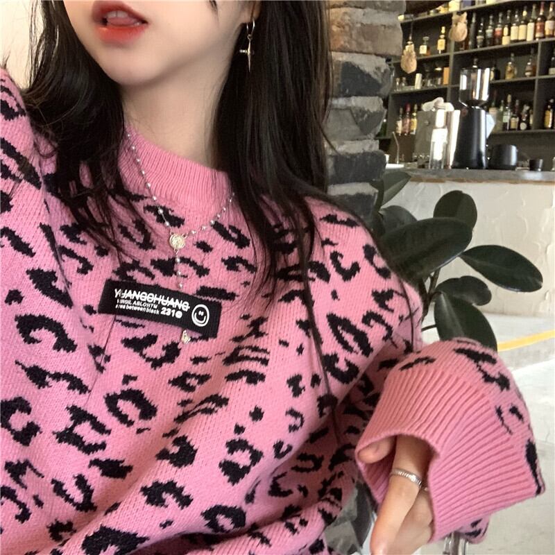 スプリングオータムスタンダードレオパードプリント柄ルーズスタイルニットセーター レディース ロング レッド レトロ 春物 秋物 misskkl74578974085