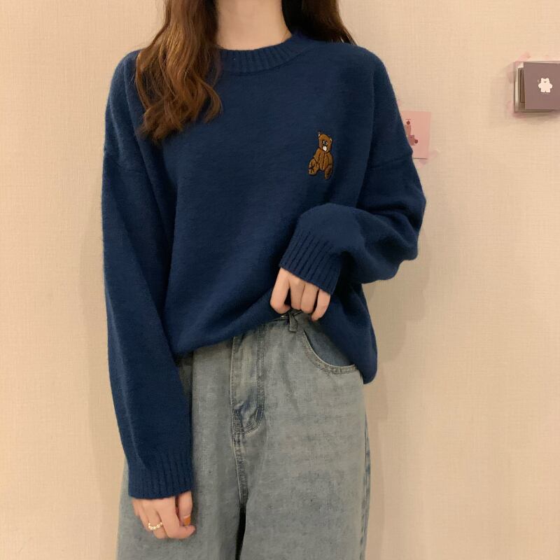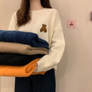 スプリングオータムルーズ刺繍ラウンドネック長袖スリーブセーター レディース ロング 春物 秋物 Oネック misskkl24056518355