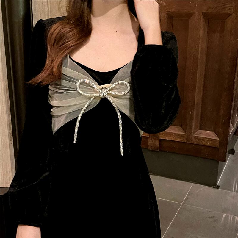 スプリングオータムスリムリボンベルベットドレス 長袖スリーブブラック ロング 春物 秋物 スクウェア misskkl71702759126