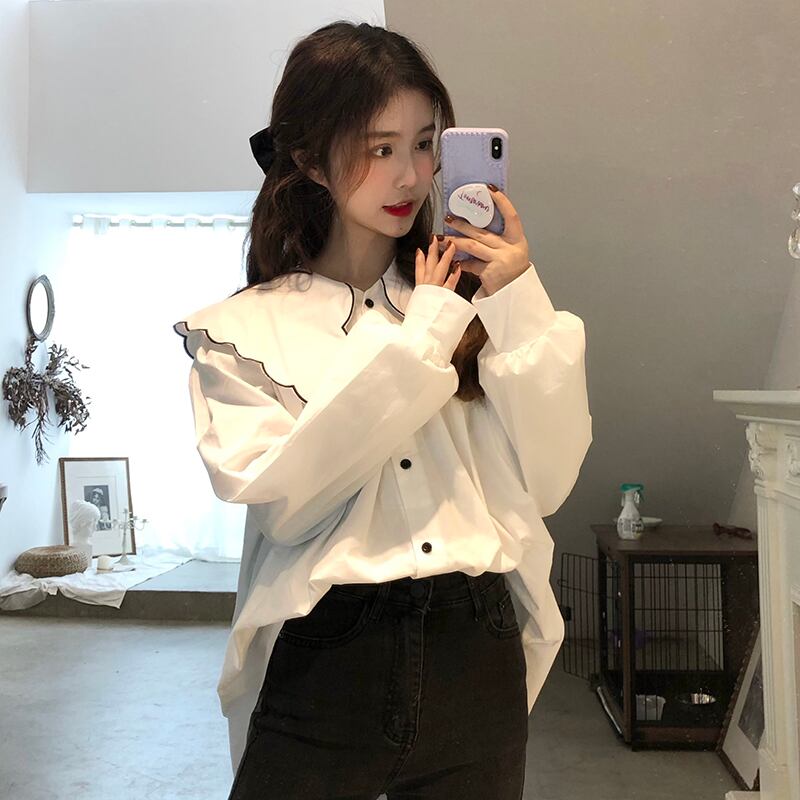 スプリングオータムルーズカラー格子柄ネイビーシャツ トップス ロング 春物 秋物 misskkl51321089743