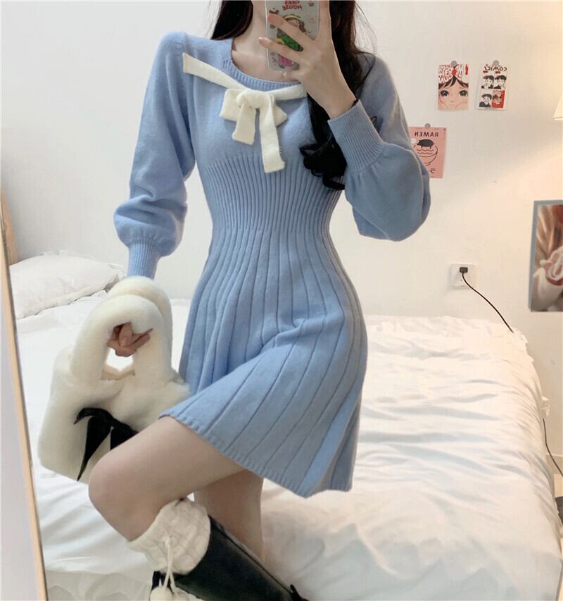 ウィンターAラインハイウェストウェスト薄手ソリッド カラーニットドレス スカート ロング 冬物 ソリッドカラー misskkl43126392576