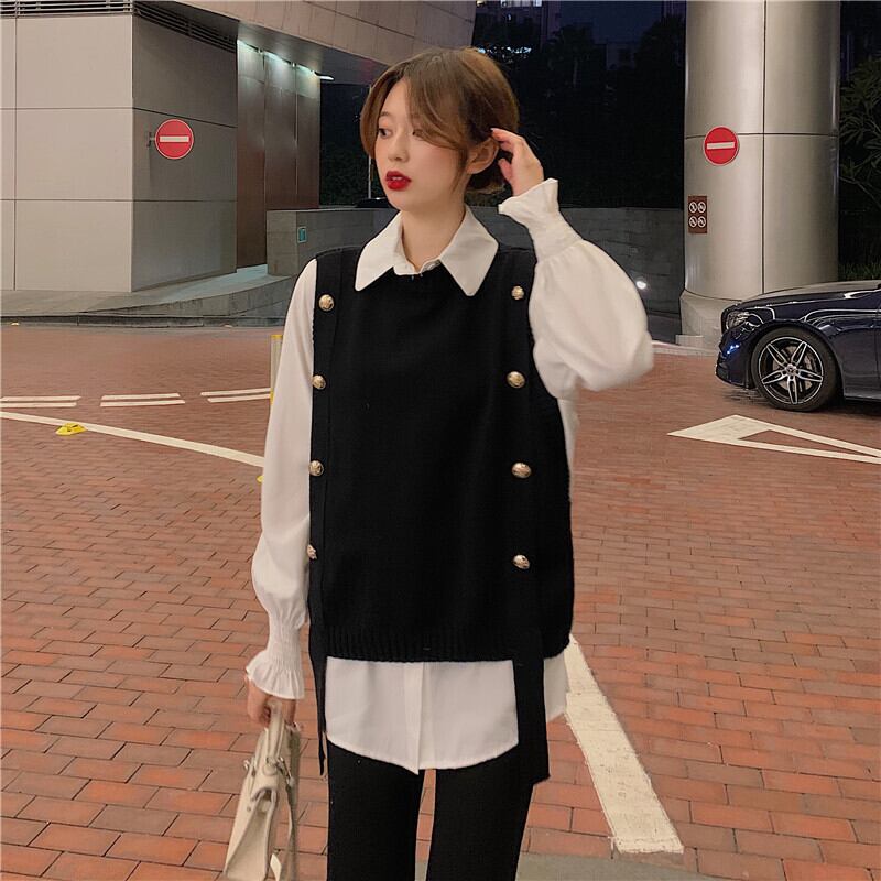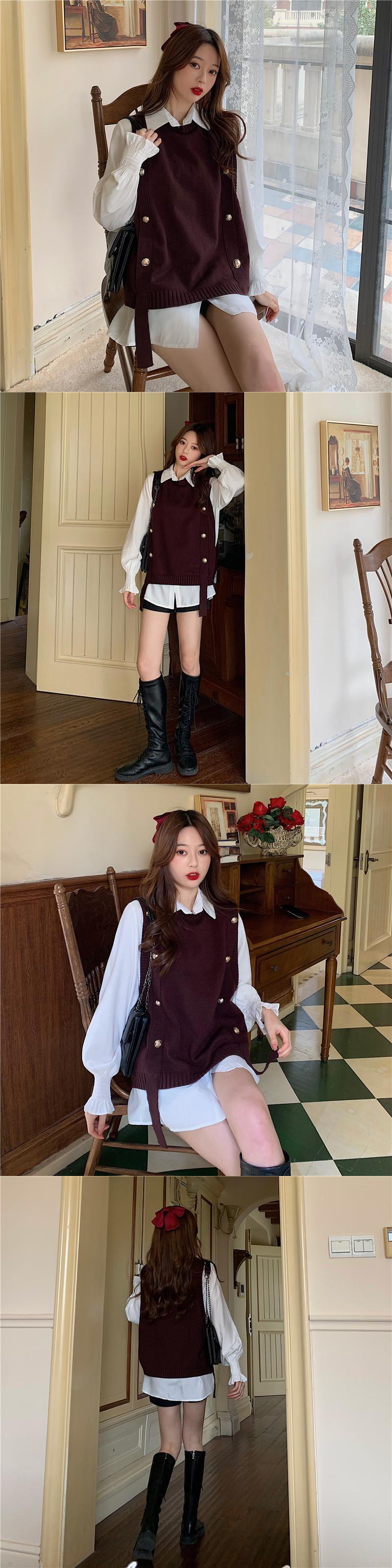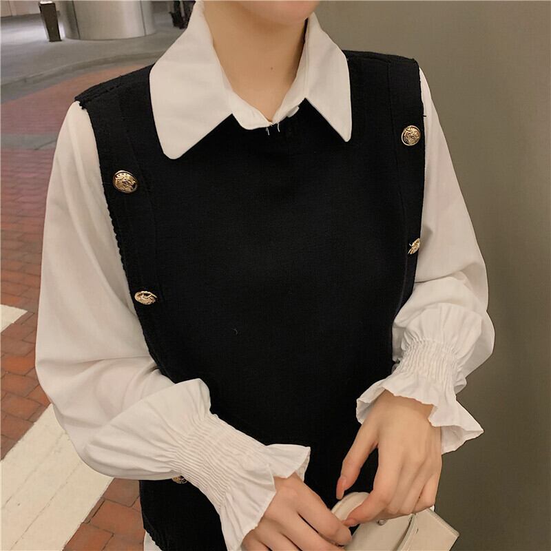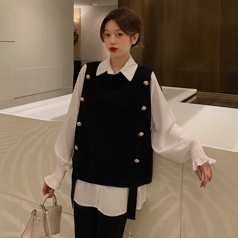 色:白いシャツのワンピース,ブラックベストワンピース,コーヒーカラーベストシングル