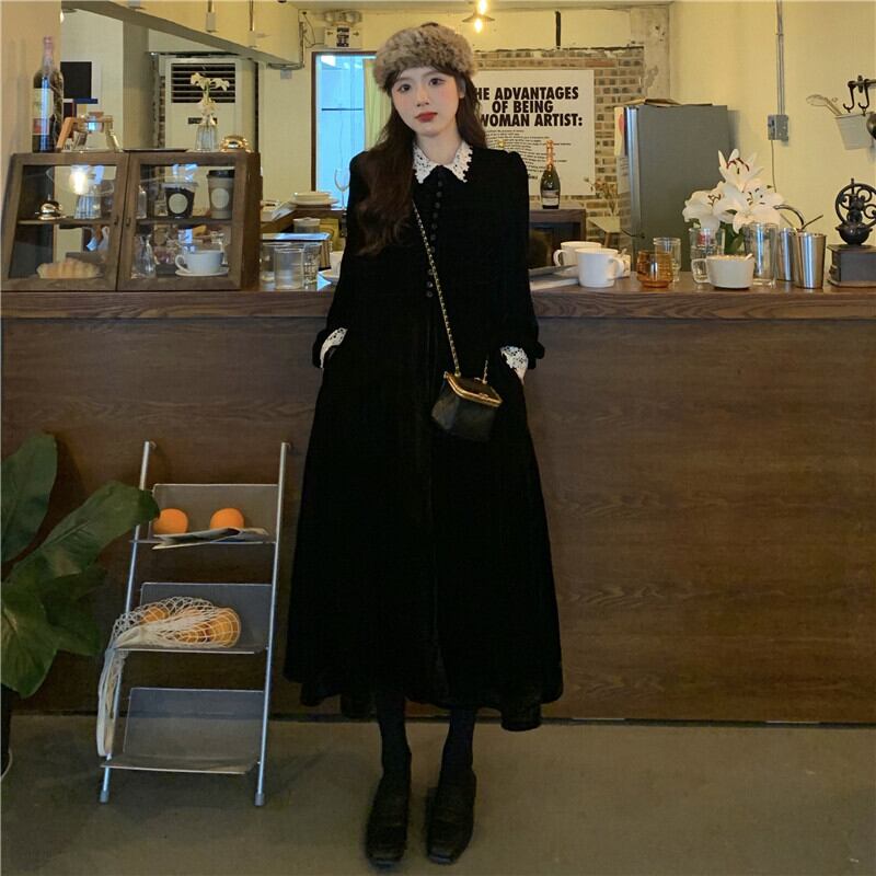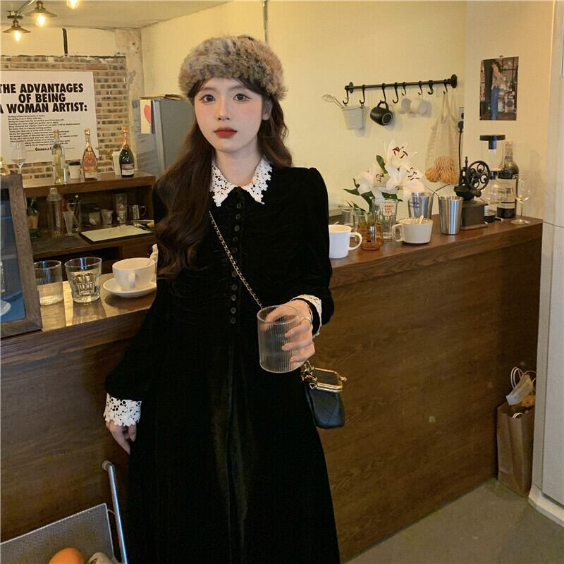 ウィンタースタンダードハイウェストウェストスリムカラーレースドレス ロング レトロ 冬物 ステッチ misskkl38578753579