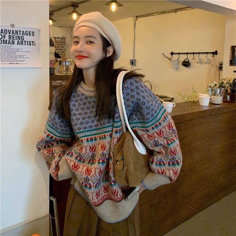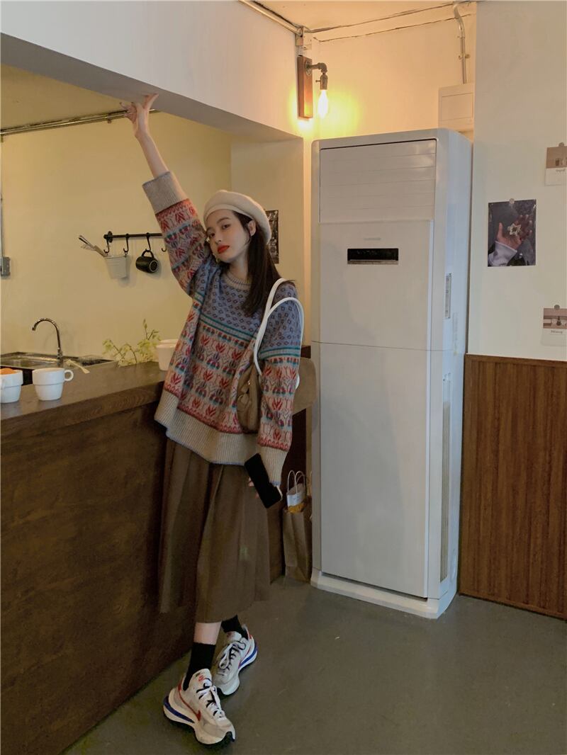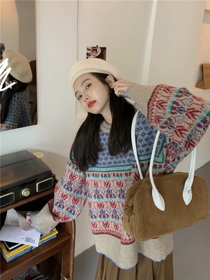 ウィンタースタンダードジャカードニットルーズスタイルセーター トップス レディース ロング レトロ 冬物 misskkl3436234937