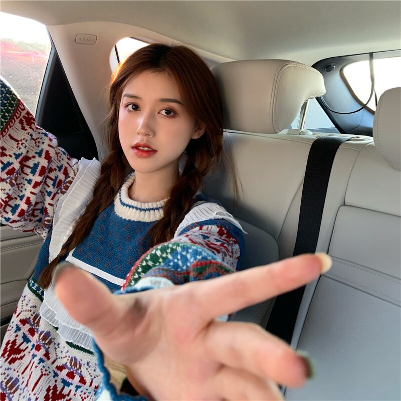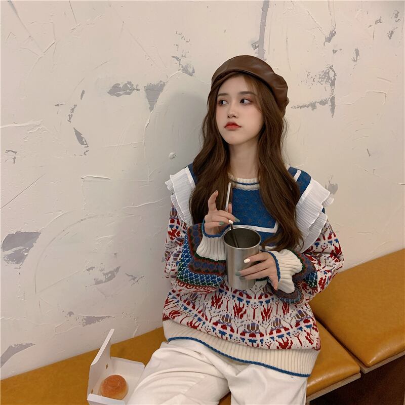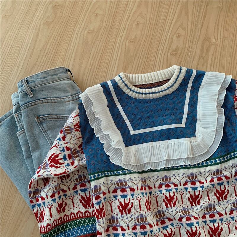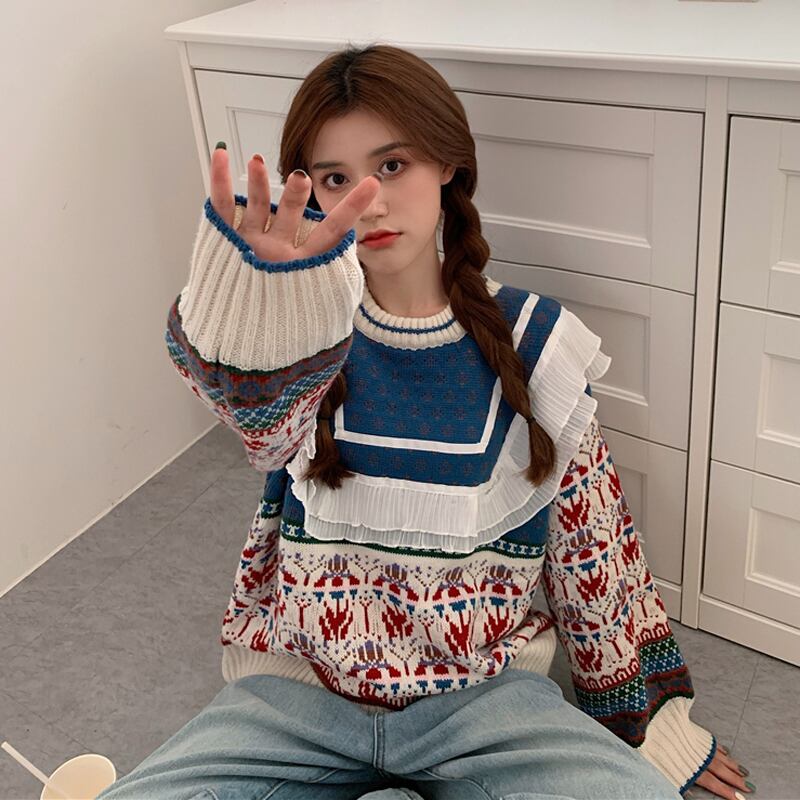 スプリングオータムスタンダードメッシュルーズスタイルセーター レディース ロング レトロ 春物 秋物 ステッチ misskkl64256109631