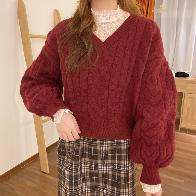 スプリングオータムショートセーター ロング ランタンスリーブ 春物 秋物 Vネック misskkl91760897432