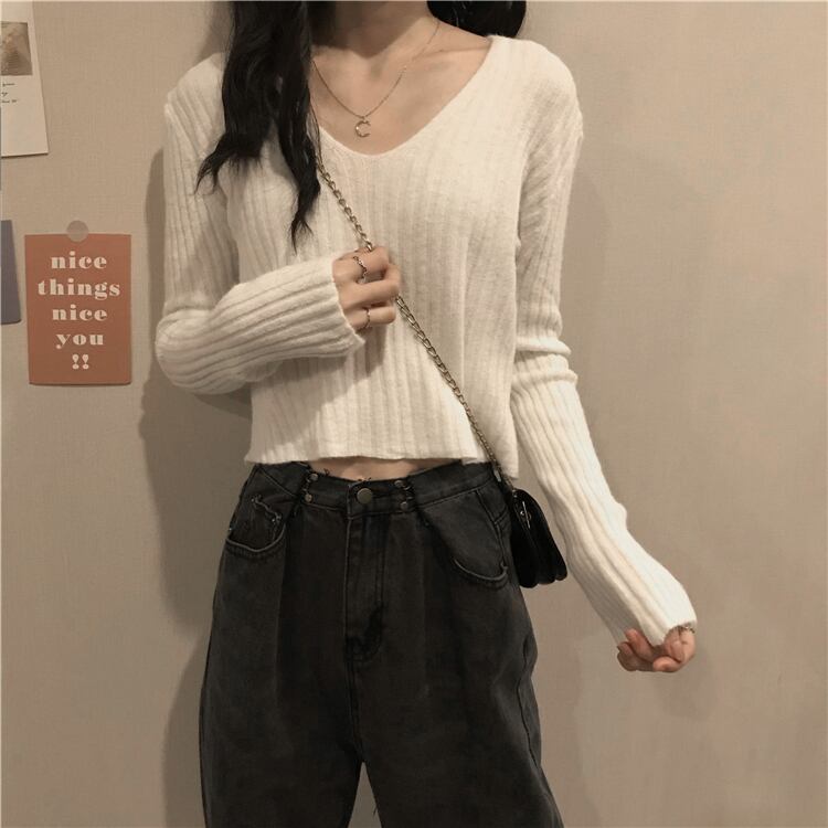 シャツ スプリングオータムショートトップス ニットセーター スリムVネック ロング 春物 秋物 misskkl36284572126