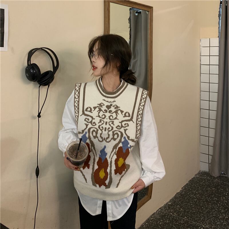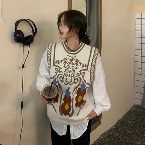 スプリングオータムスタンダードエスニックスタイルジャカードニットルーズノースリーブセーター レトロ 春物 秋物 misskkl48137000805