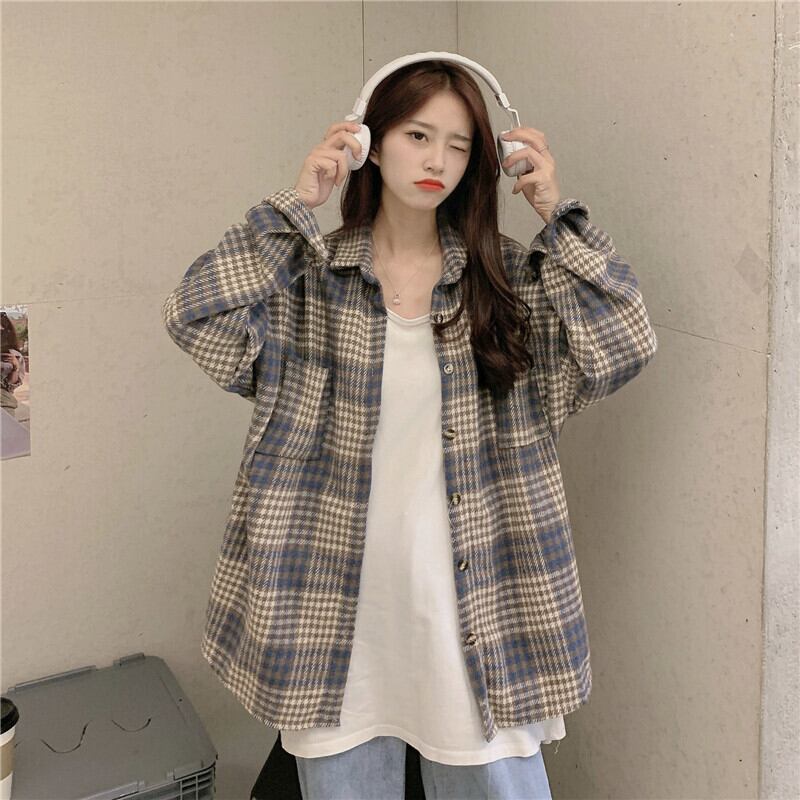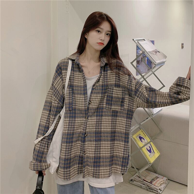 ジャケット スプリングオータムスタンダード格子柄シャツ ルーズトップス ロング レトロ 春物 秋物 misskkl93686682106