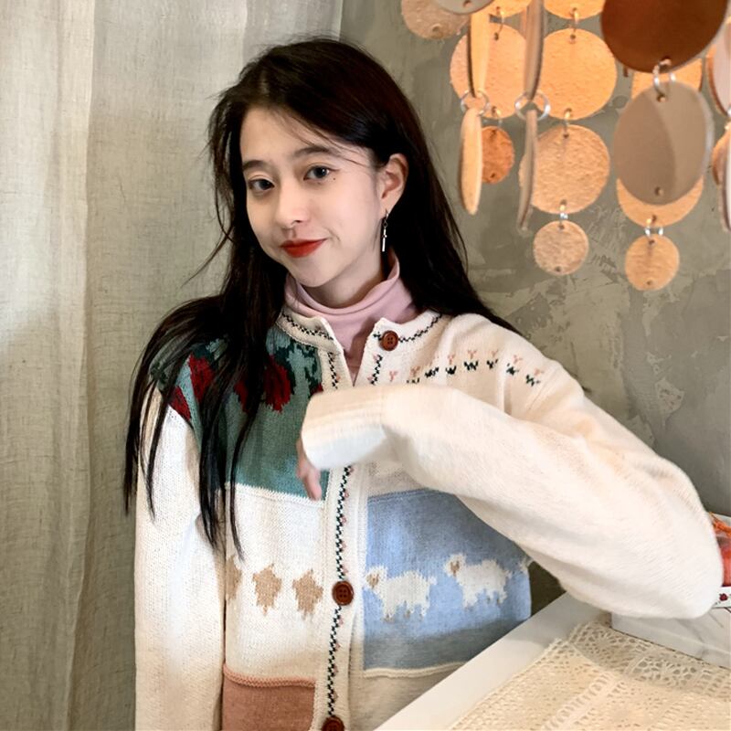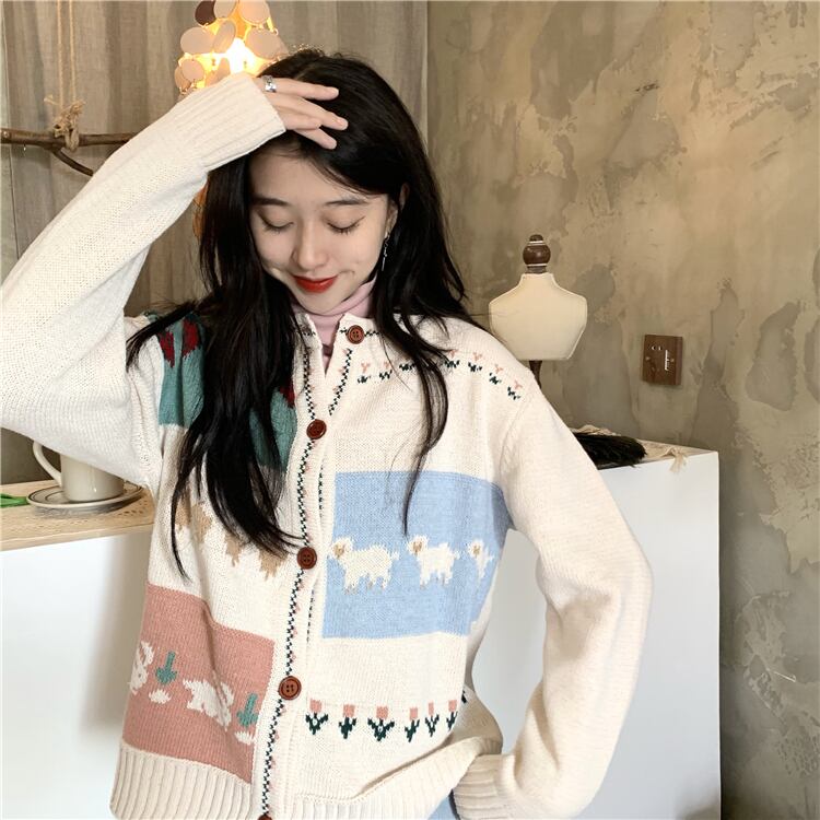 スプリングオータムルーズラウンドネックカラージャカードセーター カーディガンジャケット レディース ロング 春物 秋物 Oネック misskkl10270544071
