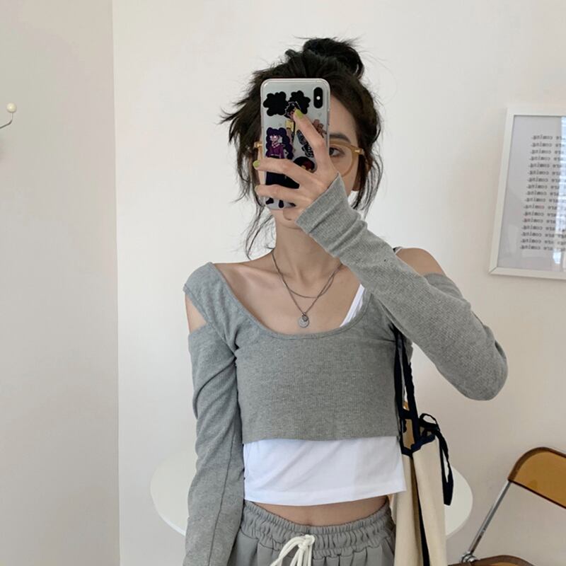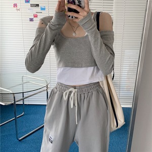 ブラウス スプリングオータムスリムTシャツ ロング レッド 春物 秋物 オフショルダー misskkl40606571420