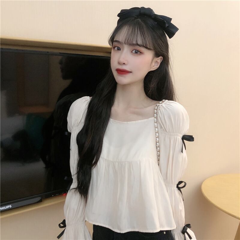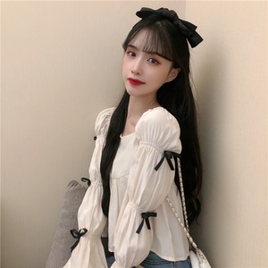 スプリング薄手ショートリボンシャツ トップス ロング 大人ガーリー スウィート キュート カジュアル 春物 スクウェア ステッチ misskkl42202911822
