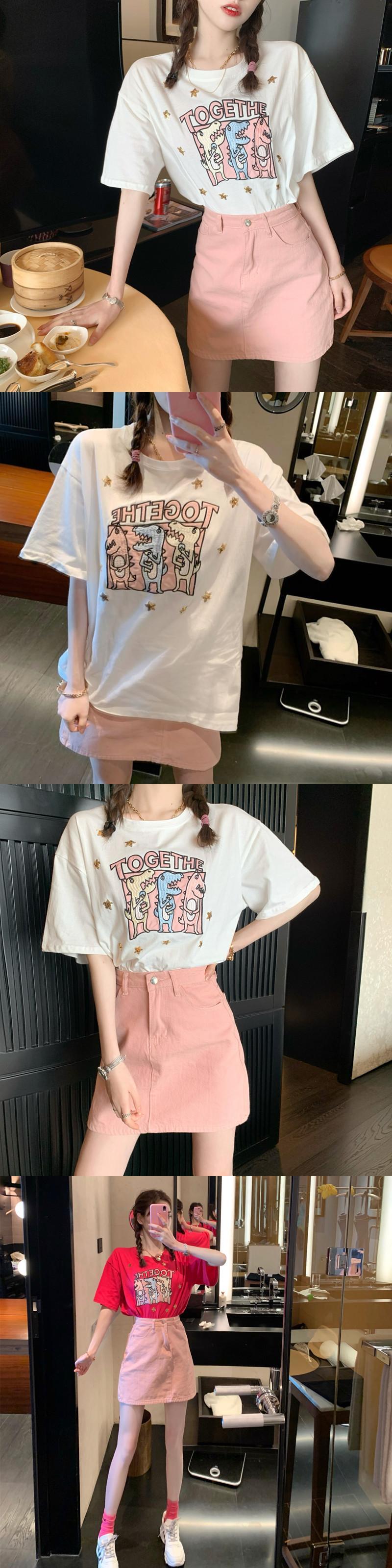 サマー刺繍ルーズレッドTシャツ スカート 大人ガーリー スウィート キュート カジュアル 夏物 misskkl1233745522