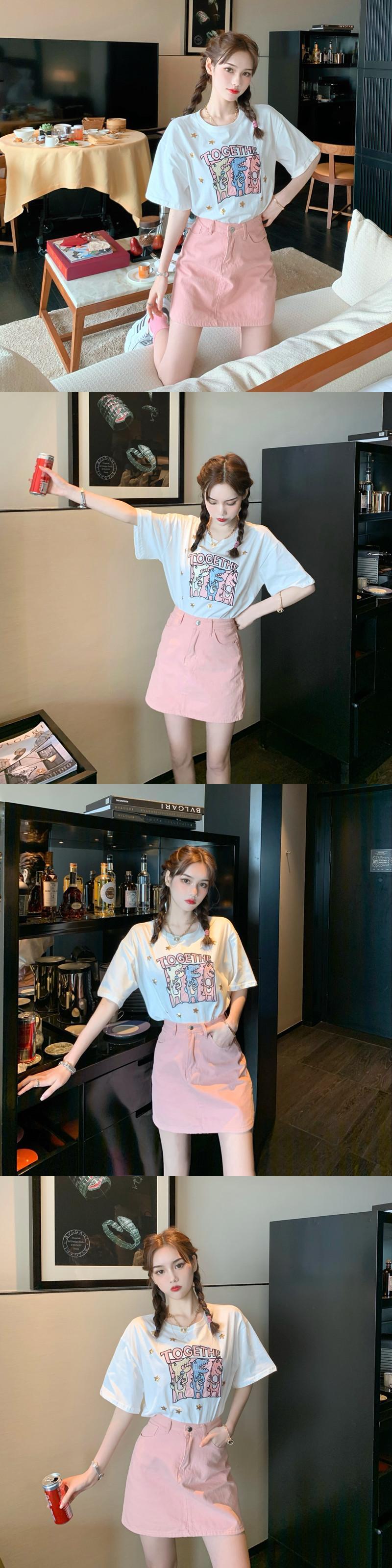 色:ピンクデニムスカート,白いTシャツ,ベリーTシャツ