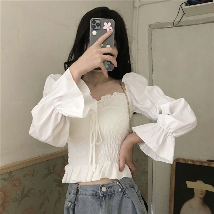 ホワイトハイウェストウェストショートブラウス スタイルスプリングシャツ ロング 春物 misskkl81497820685