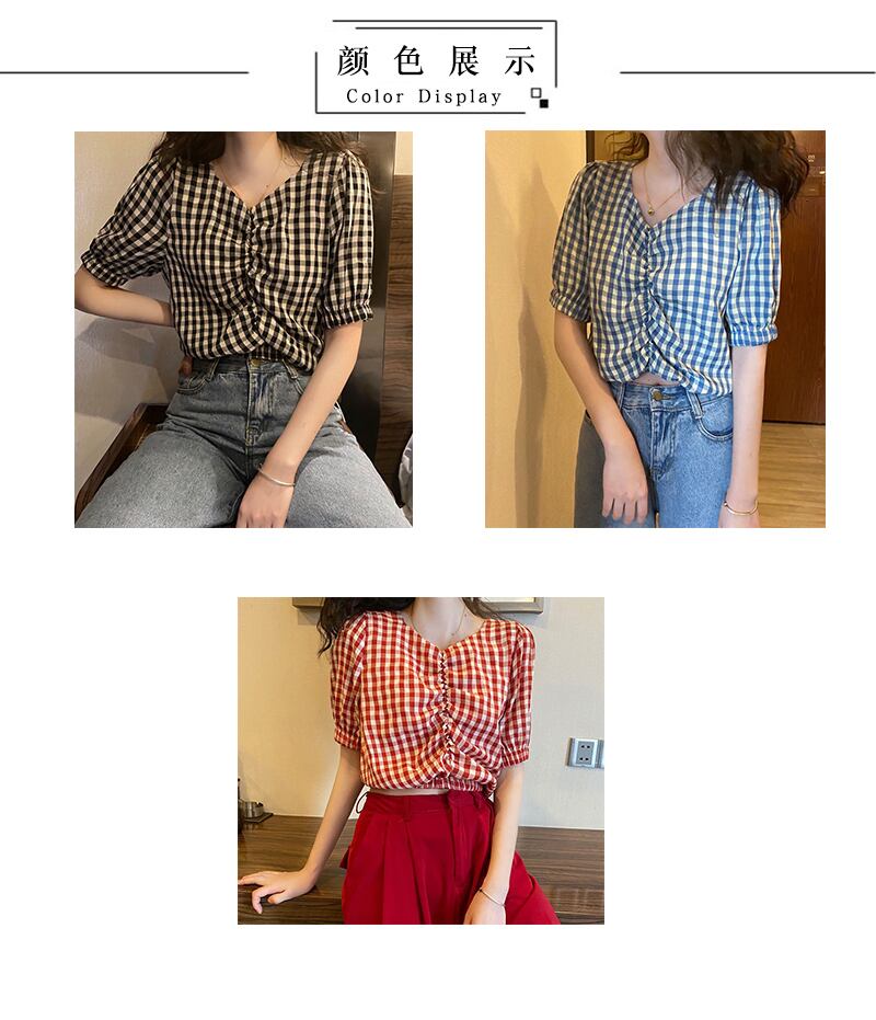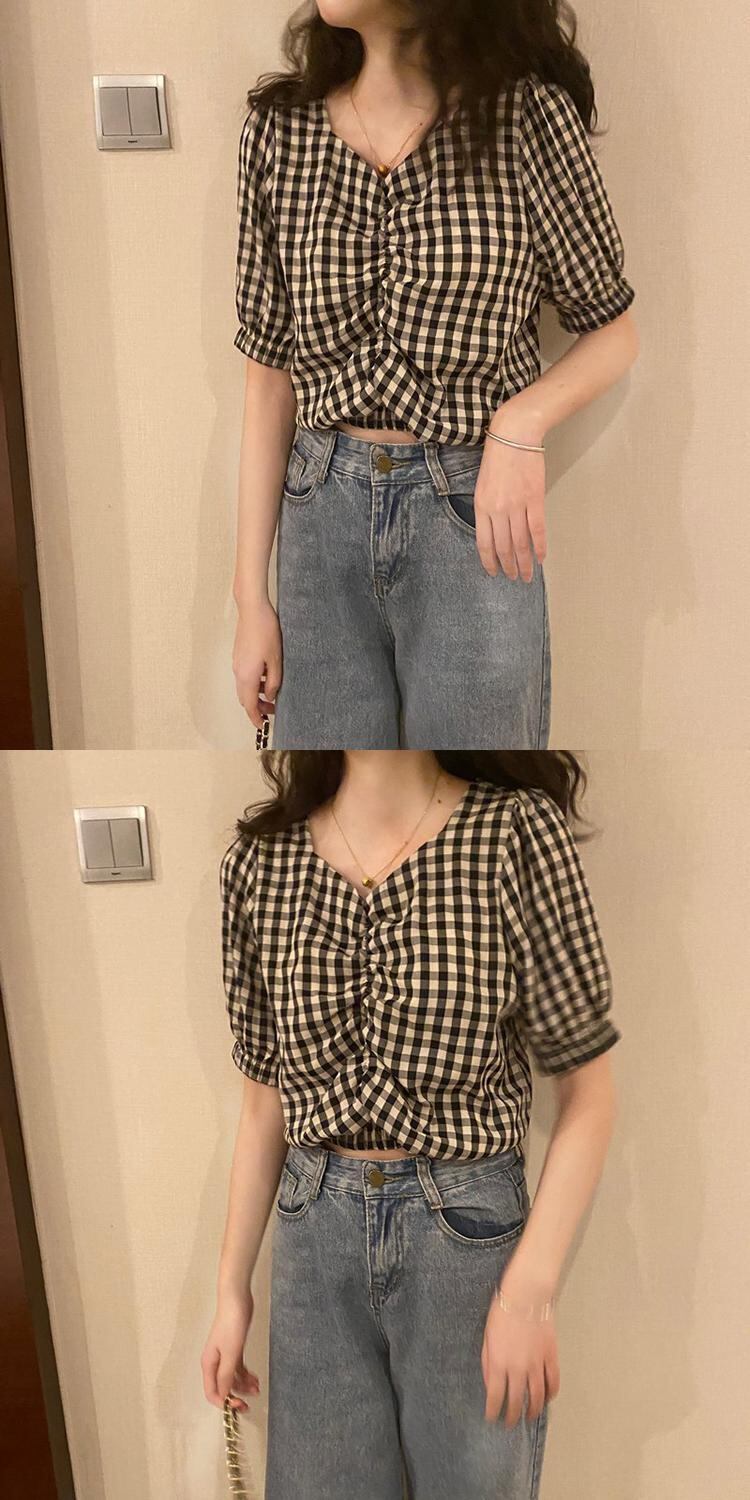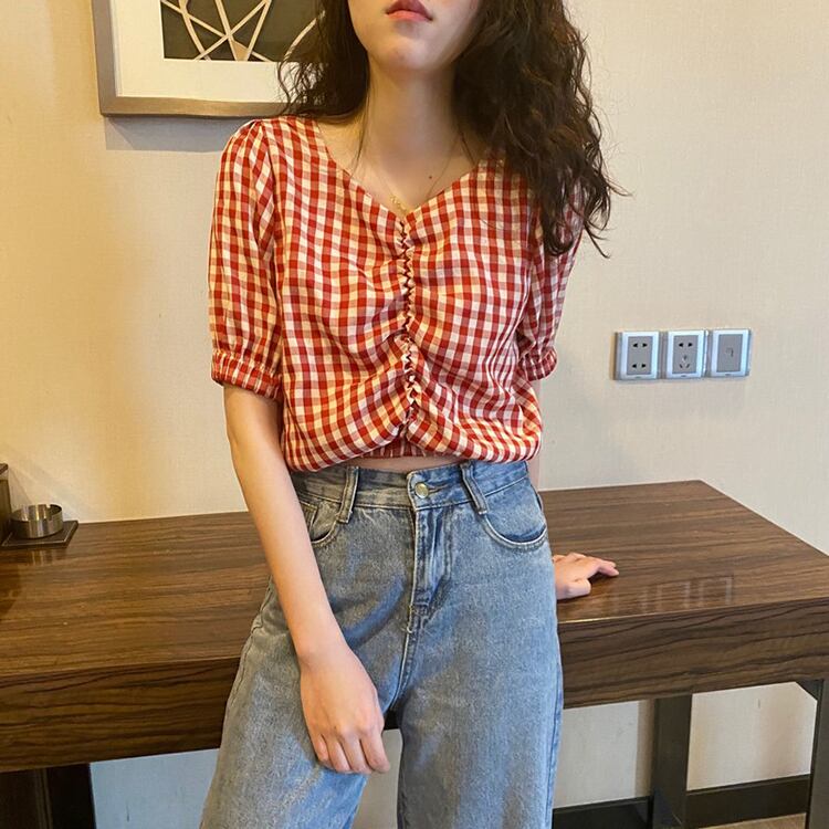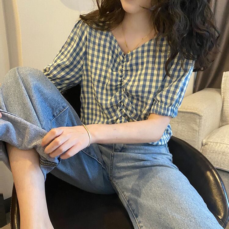 格子柄シャツ Vネックショートハイウェストウェストサマートップス 夏物 misskkl29977905191