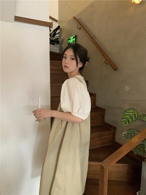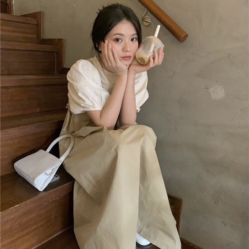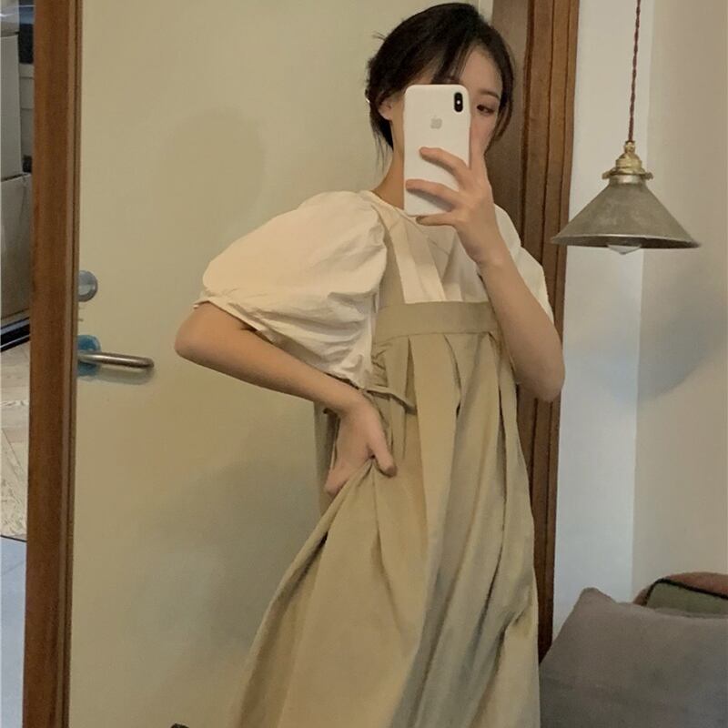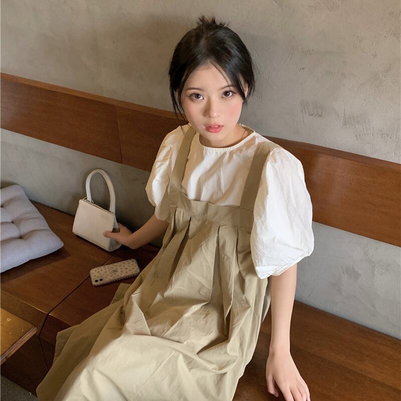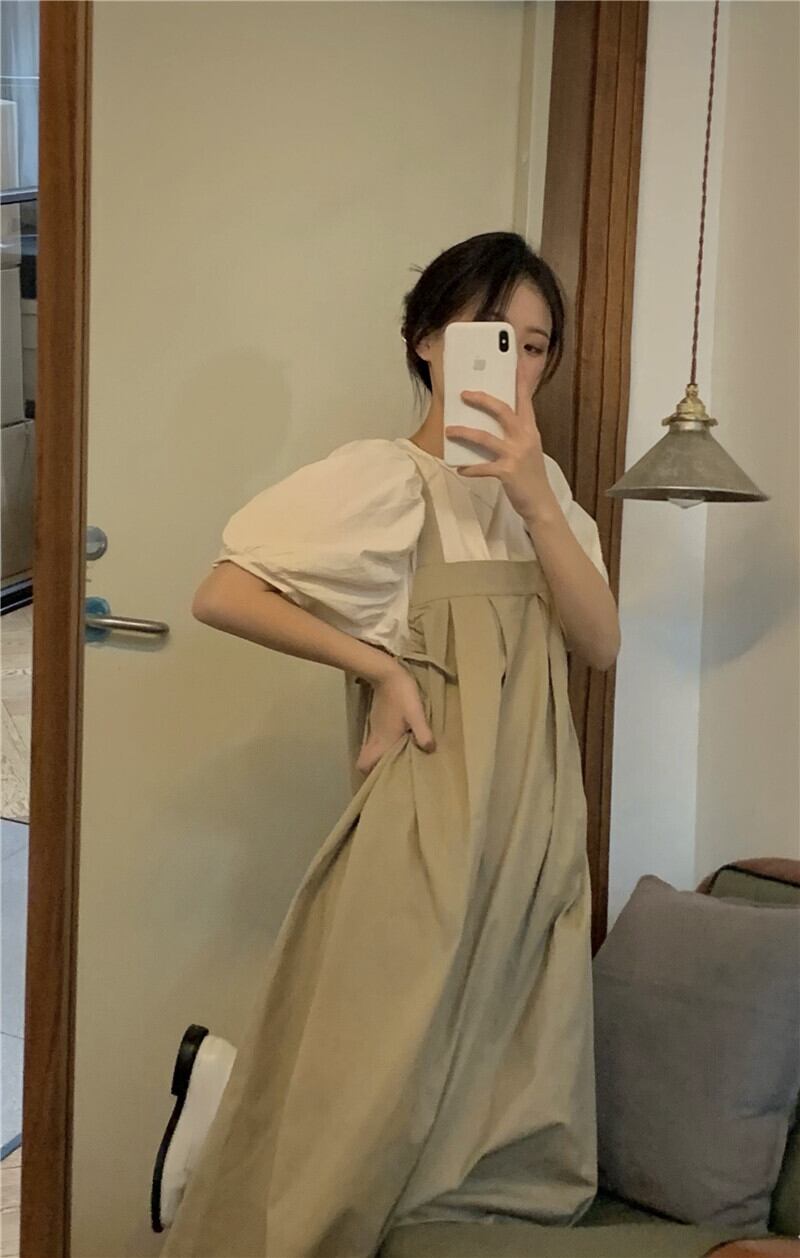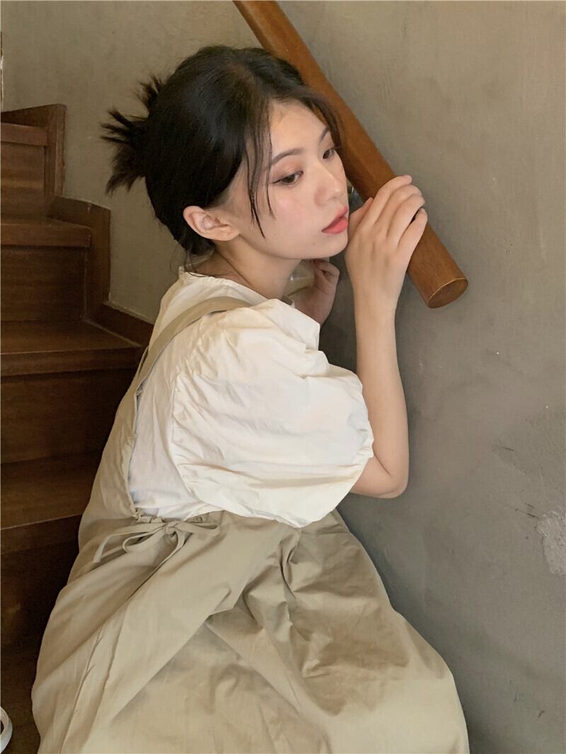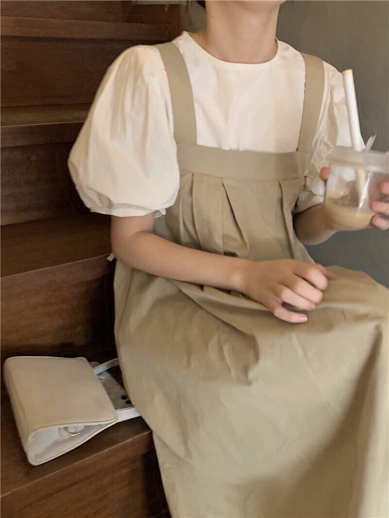 色:白いストラップドレス,グレートップ,カーキストラップドレス,アプリコットトップ