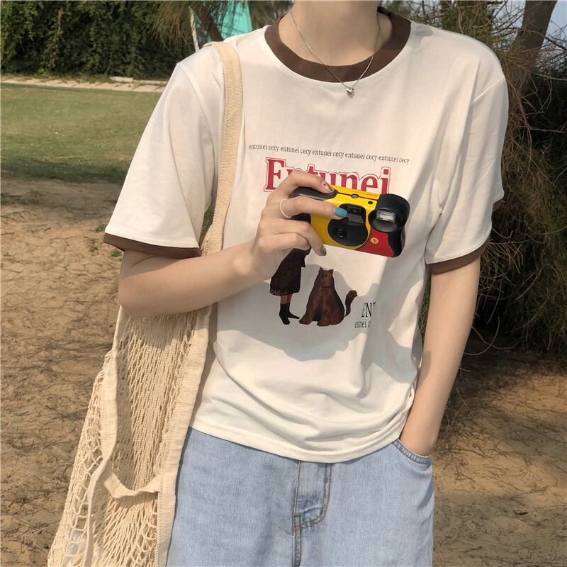 サマースタンダードカラーラウンドネックプリントルーズTシャツ トップス レトロ 夏物 Oネック misskkl43169610808