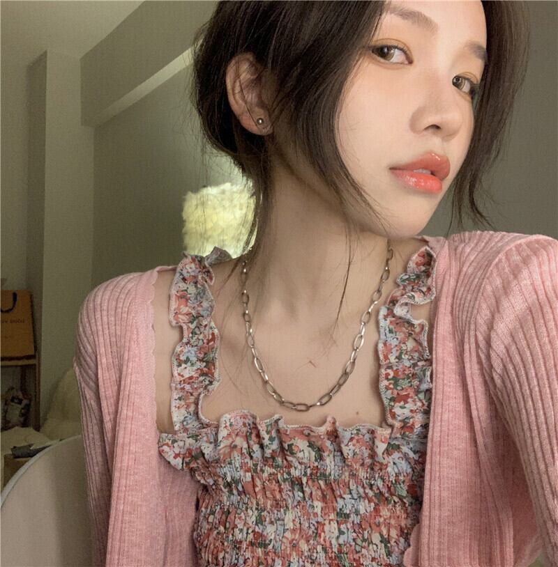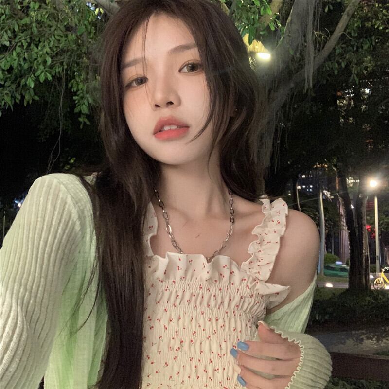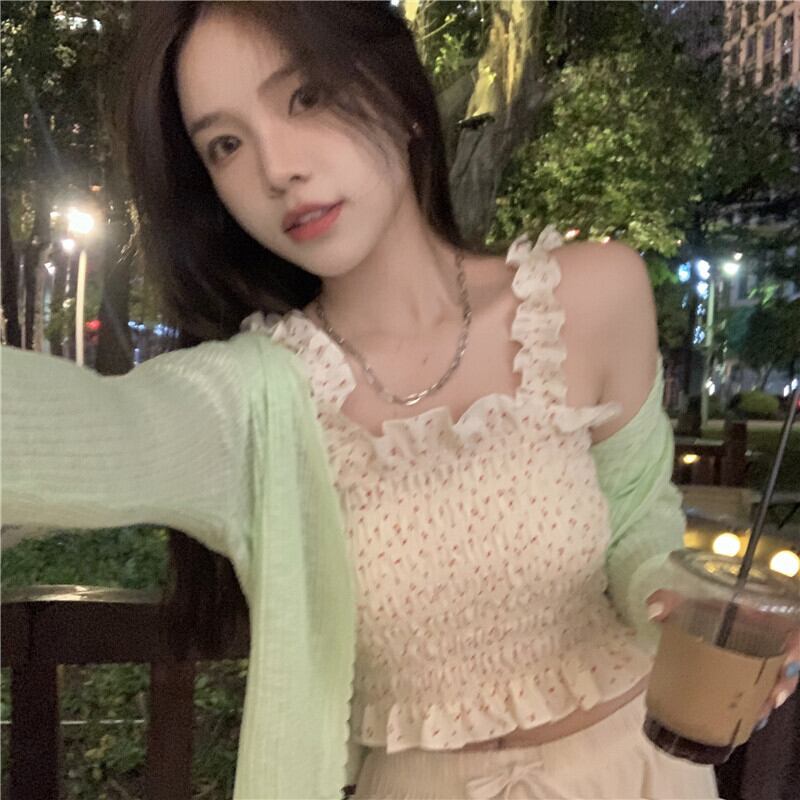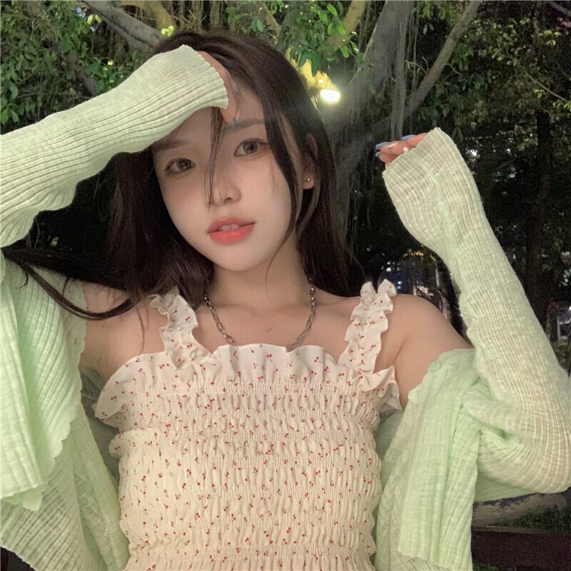 色:グリーンカーディガン,赤いサスペンダー,アプリコットスリング,赤いカーディガン
