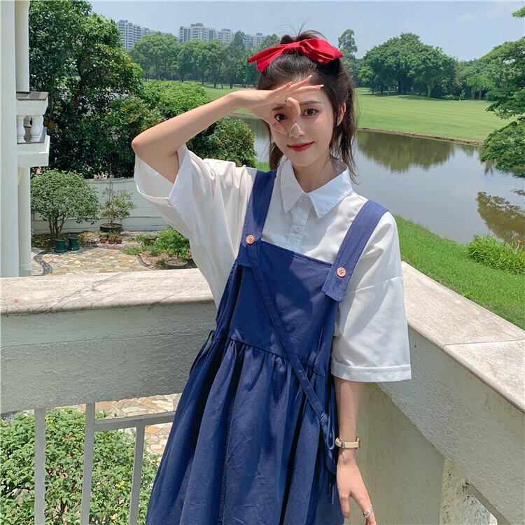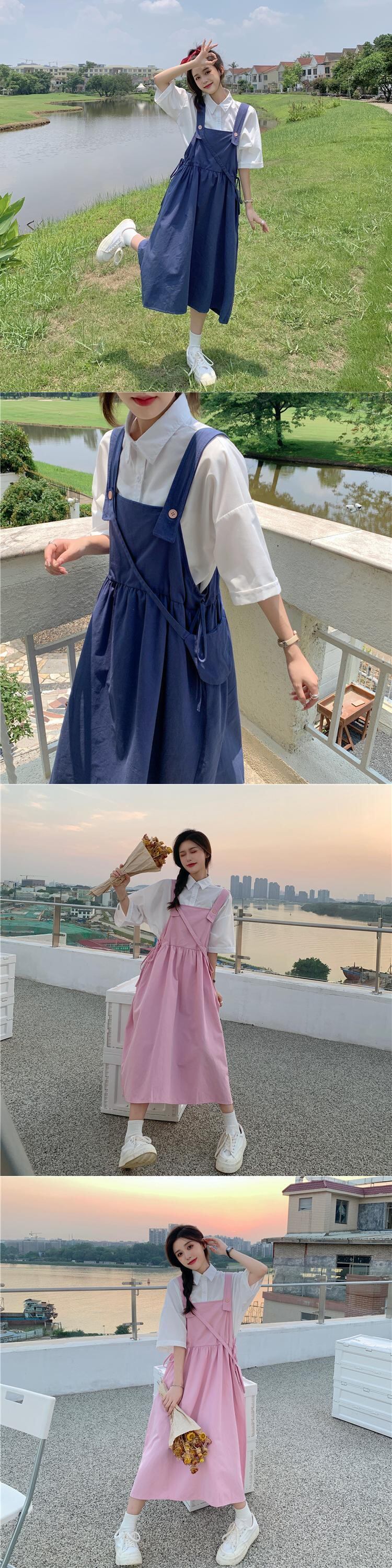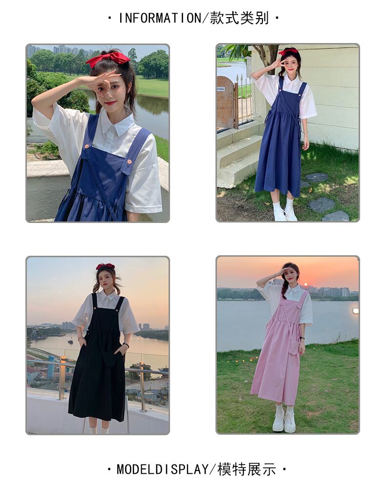 色:白のシャツ,ブルーストラップスカート+バッグ,ピンクのサスペンダースカート+バッグ,黒のストラップスカート+バッグ
