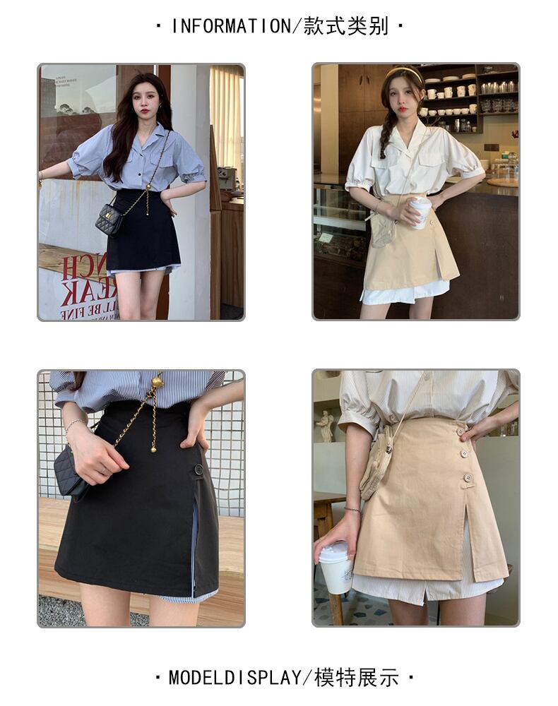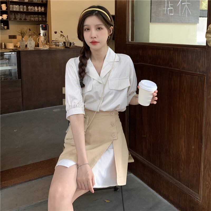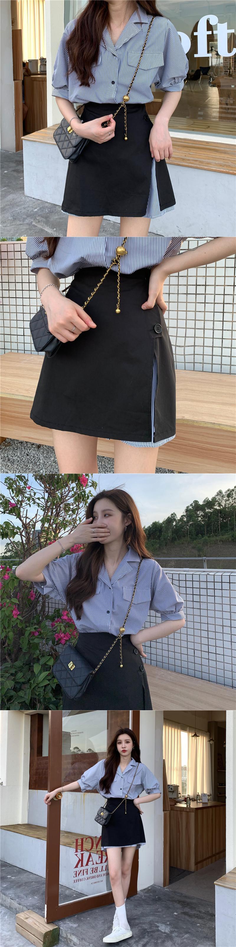 色:ブラックストライプシャツドレス,カーキ色のスカート,黒スカート,アプリコットストライプシャツドレス
