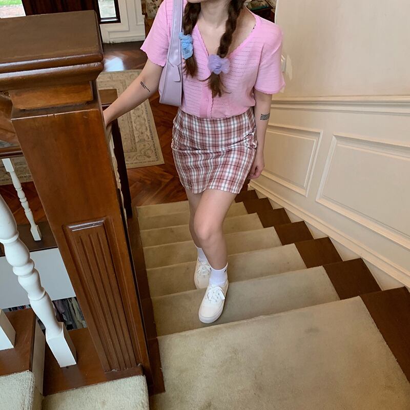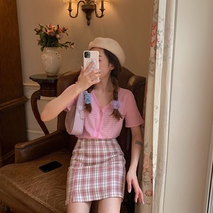 サマースカート ハイウェストウェストショート格子柄 夏物 パープル misskkl96459603065