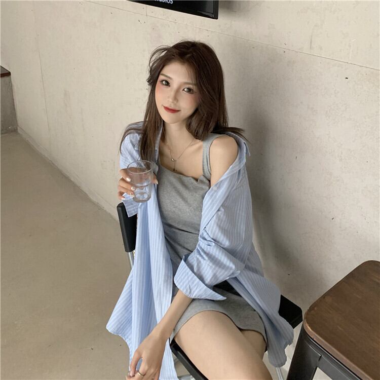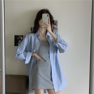 スプリングオータムルーズブルーホワイトストライプシャツ トップス ロング 春物 秋物 misskkl37021225959