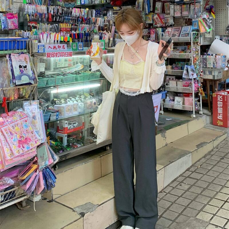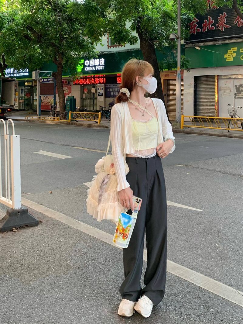 色:クリーミーな黄色のスリング,白いカーディガン,ヘンプグレーパンツ