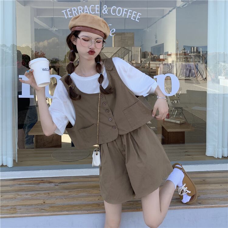色:カーキツーピーススーツ,黒のツーピース,白のT