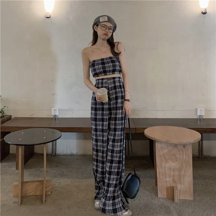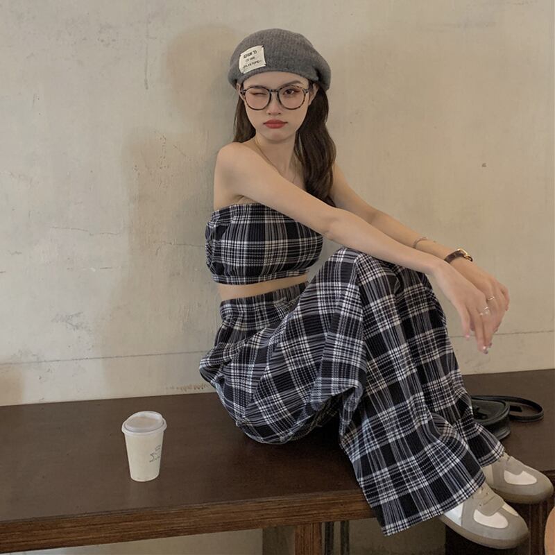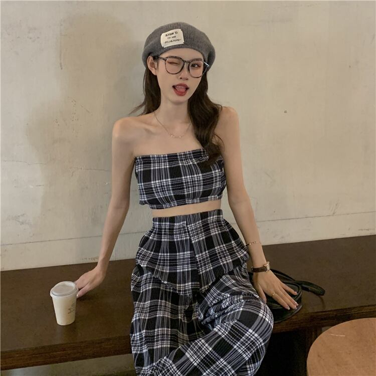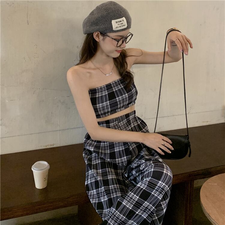 サマースタンダードスリム格子柄ショートトップス レトロ 夏物 misskkl7624499610