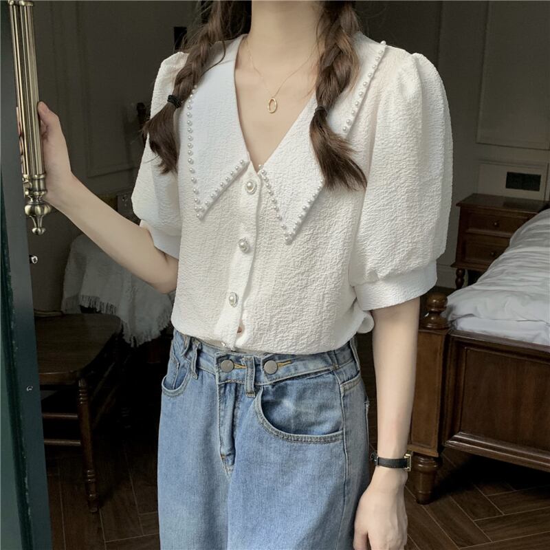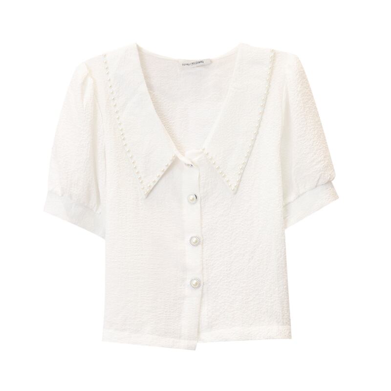 ホワイトカラーシフォンシャツ レディースサマーショート薄手スリーブトップス 大人ガーリー スウィート キュート カジュアル 夏物 misskkl99874844441