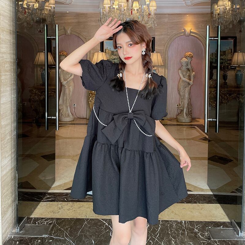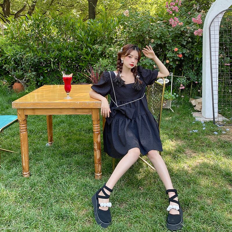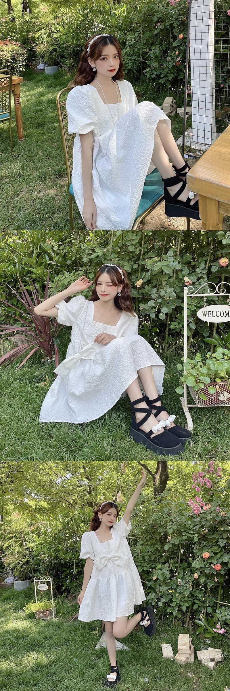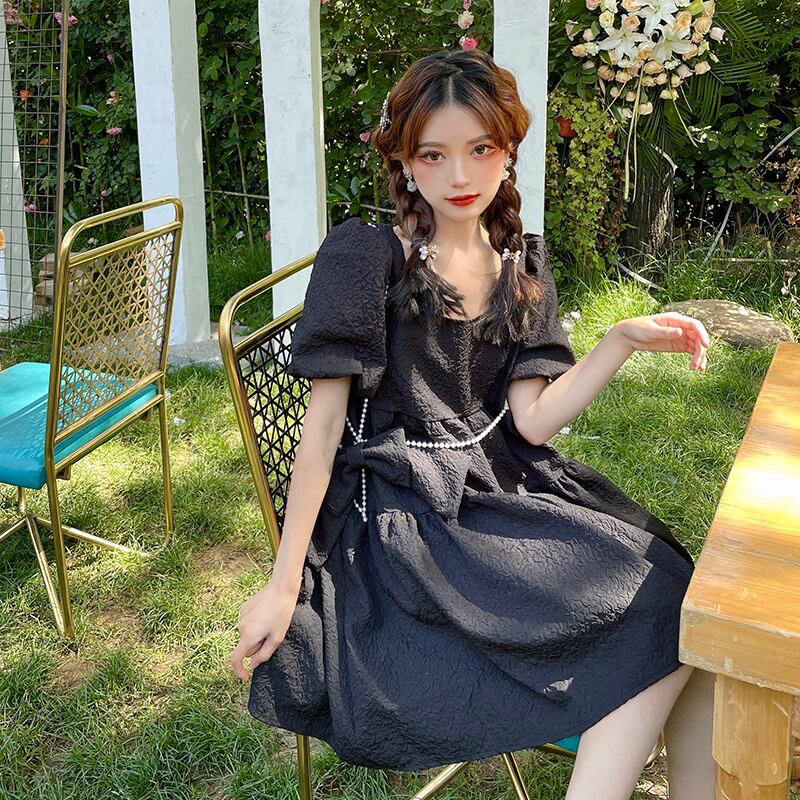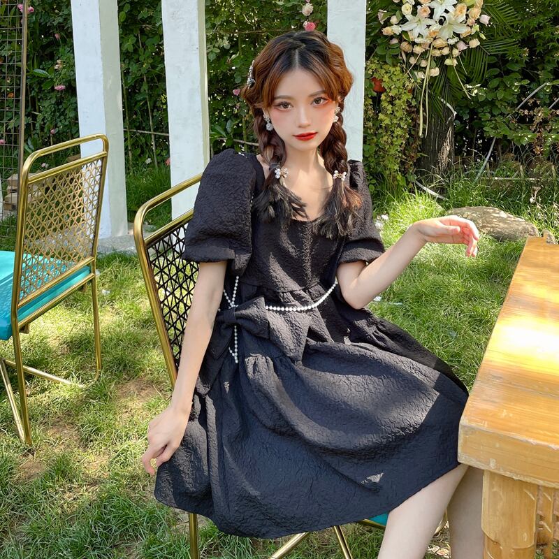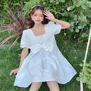 サマーリボン薄手ハイウェストウェストカラー半袖スリーブドレス スタイル ショート ハーフスリーブ 大人ガーリー スウィート キュート カジュアル 夏物 スクウェア misskkl24910150420
