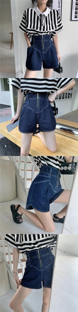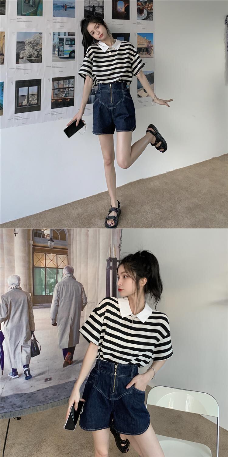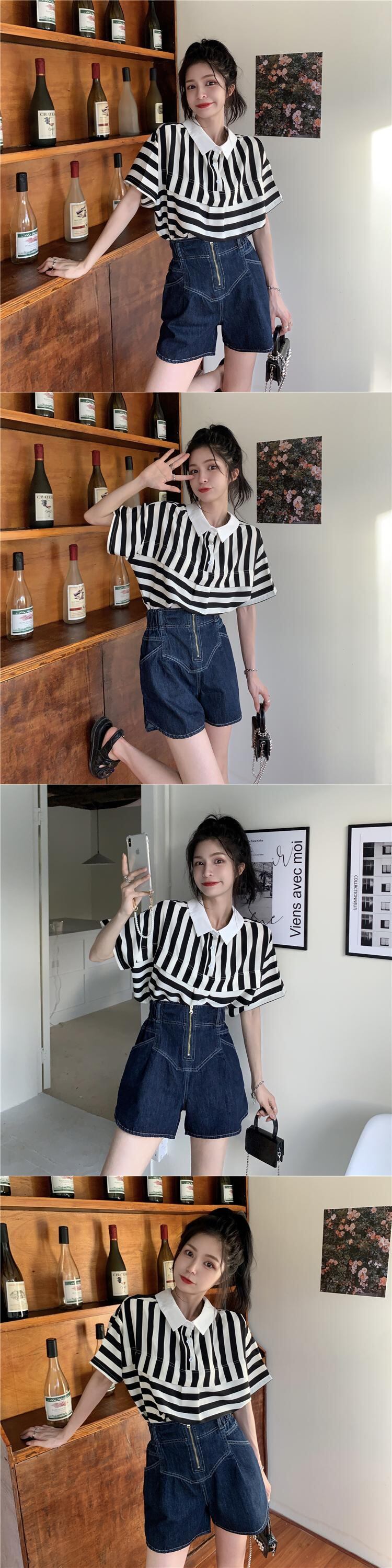 色:ブラックとホワイトのストライプトップ,デニムショートパンツ