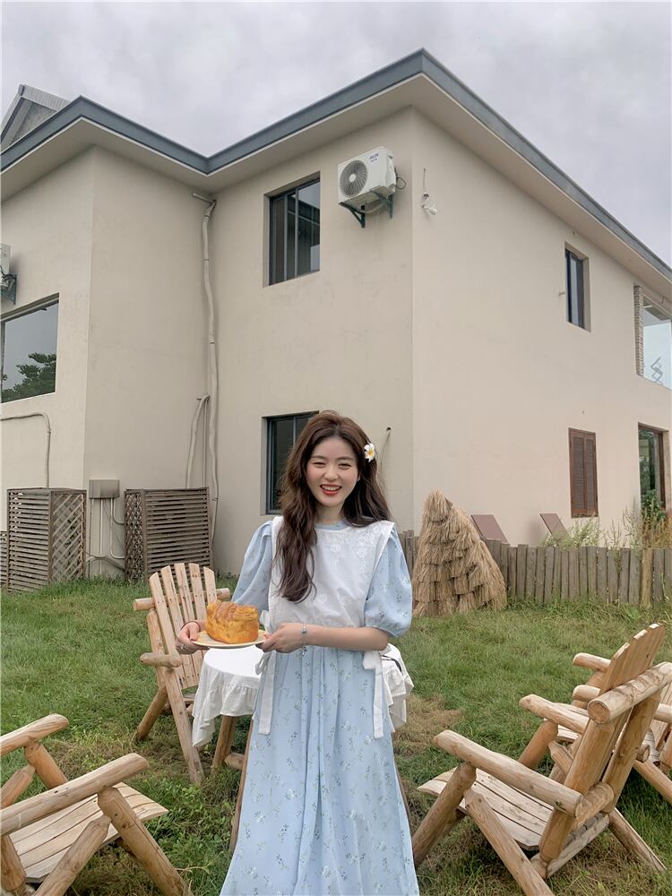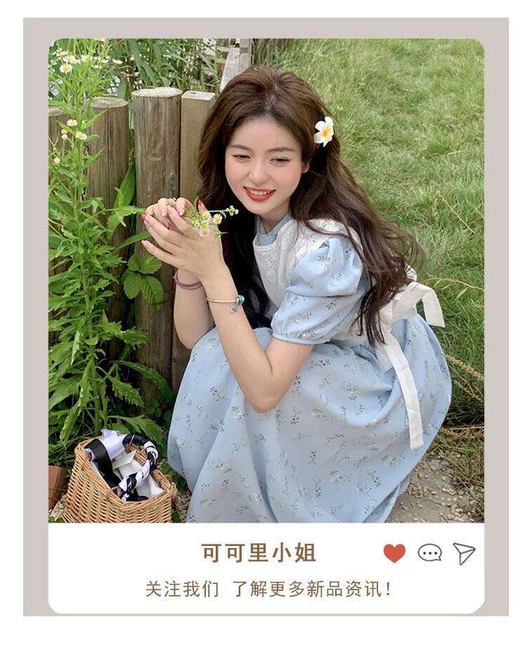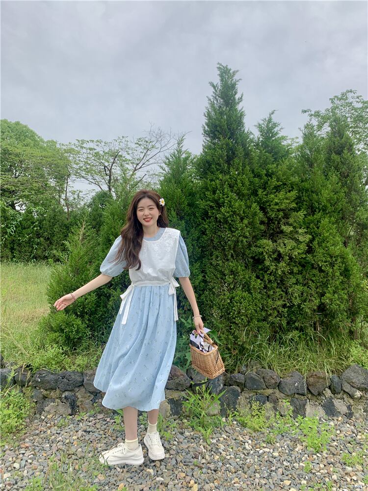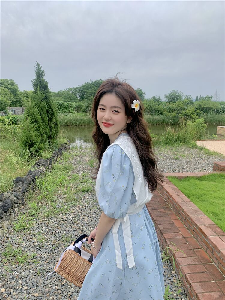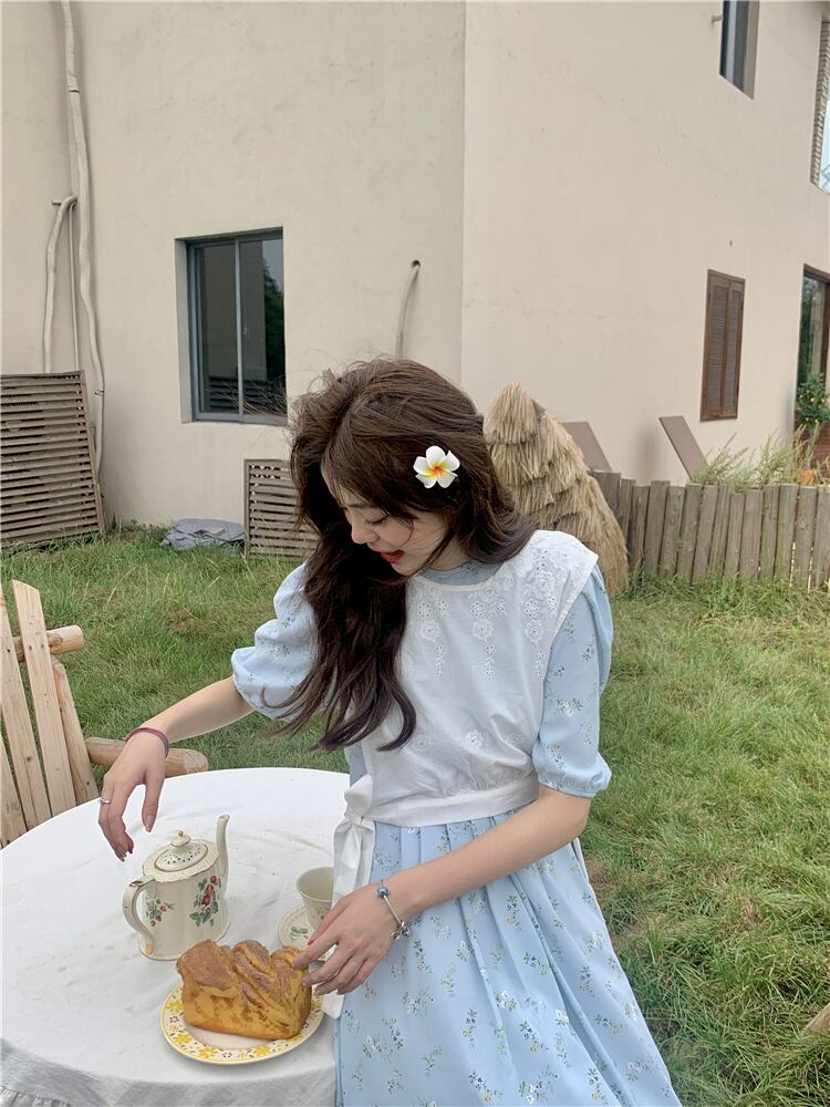 色:白いかぎ針編みのブラウス,青い花柄のドレス