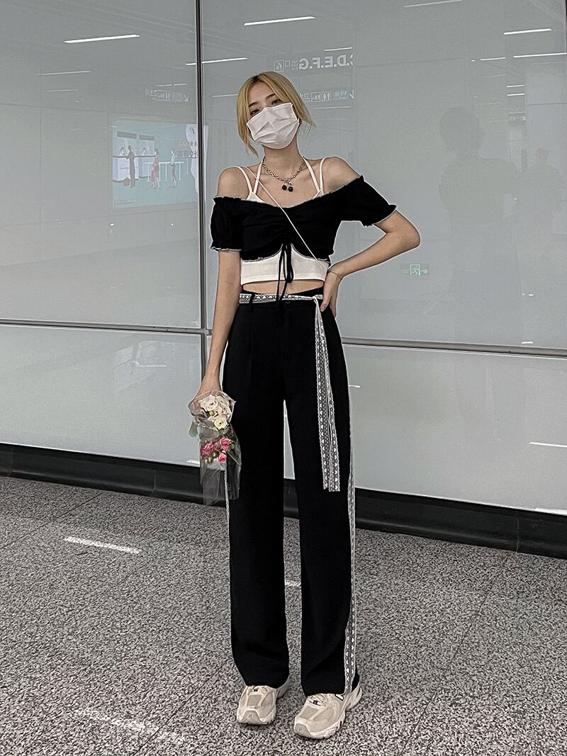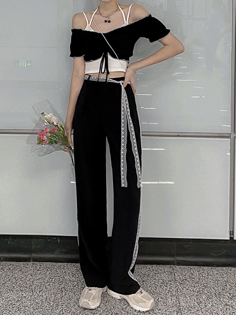 ウェストカジュアルパンツ レースサマーブラックロング 大人ガーリー スウィート キュート 夏物 ステッチ misskkl97762053061