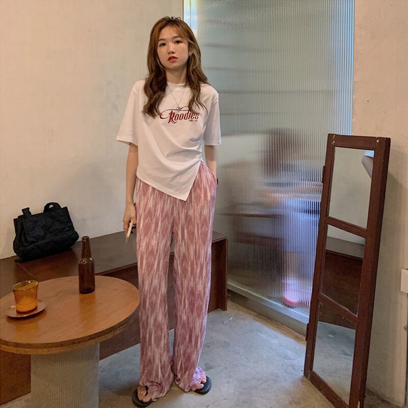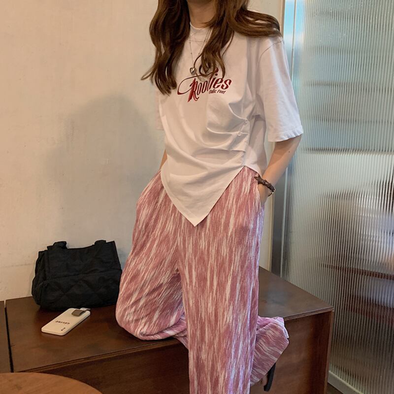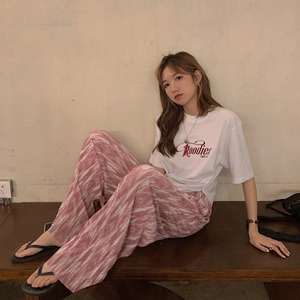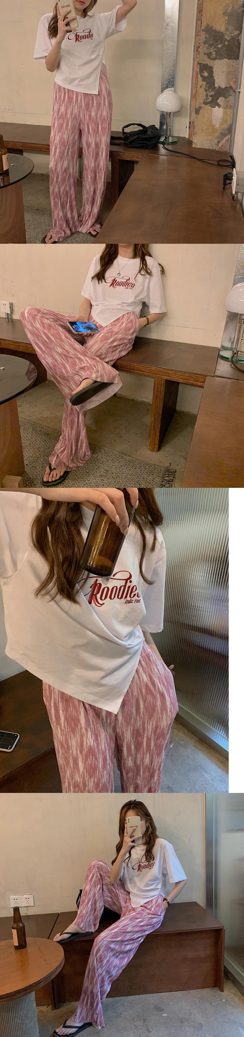 色:ピンクワイドレッグパンツ,白いTシャツ