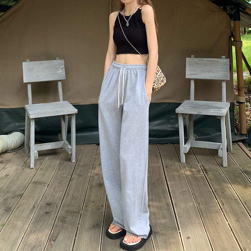 パンツ サマーストレッチハイウェストウェストカジュアルグレーワイドレッグ エラスティック 伸縮 夏物 ワイドパンツ misskkl99268146617