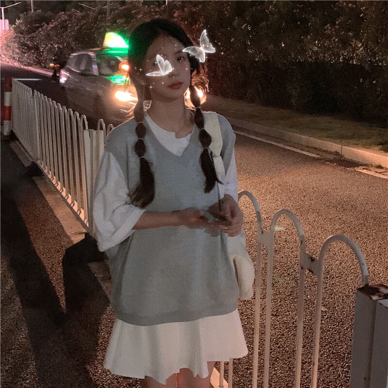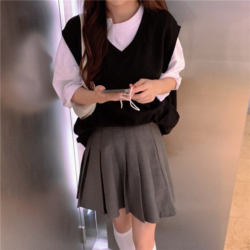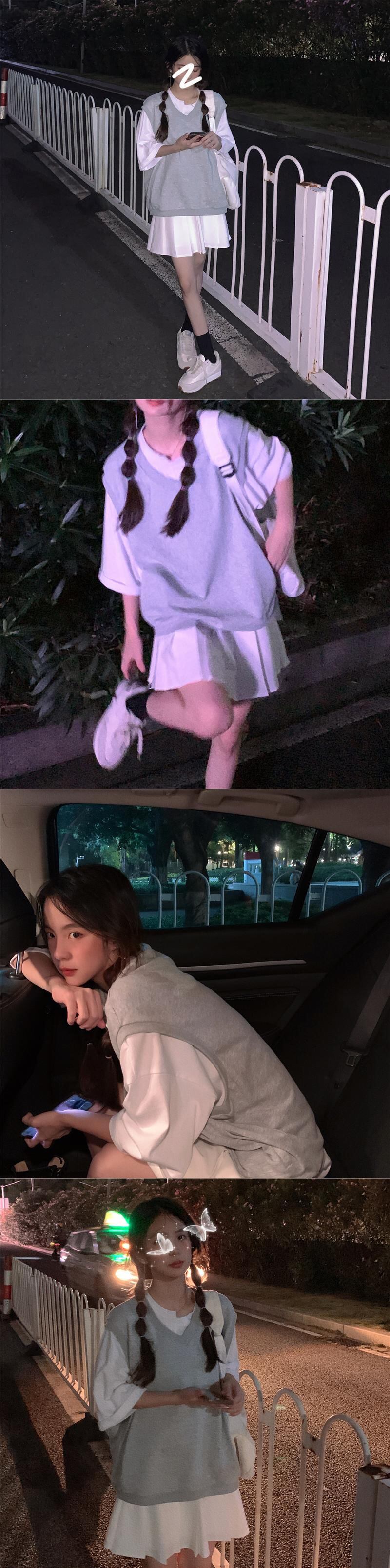 色:グレーのベスト,黒のベスト,白いスカート,Tシャツ,グレースカート