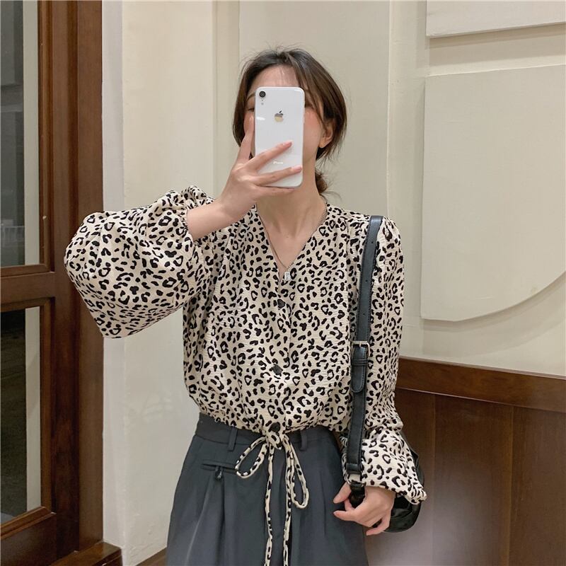スプリングオータムスタンダードレオパードプリント柄Vネックギャザールーズショートシャツ トップス レディース ロング レッド レトロ 春物 秋物 misskkl41351205120