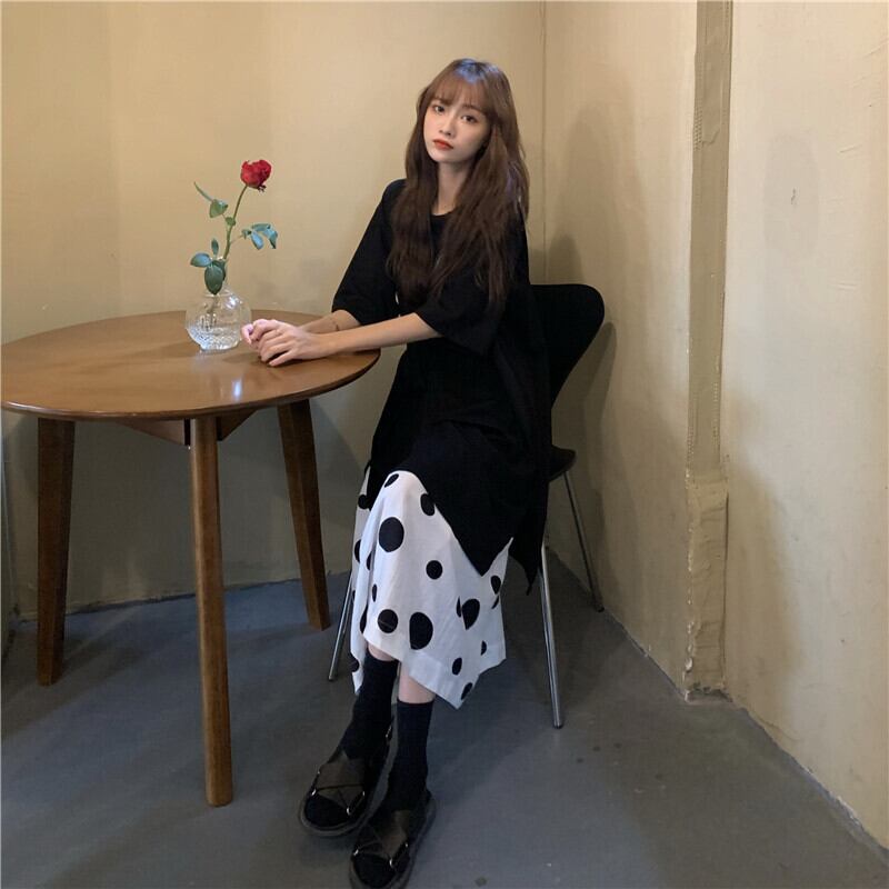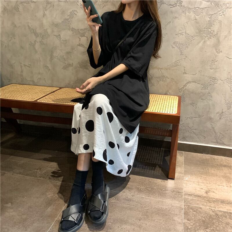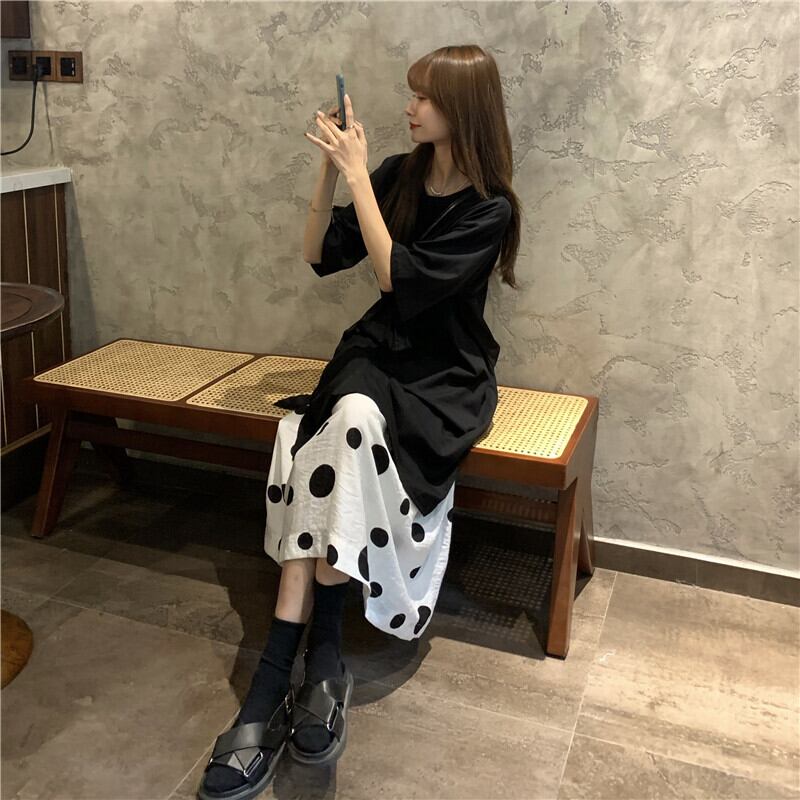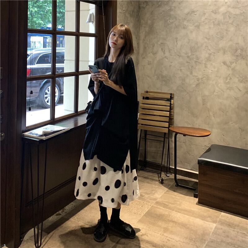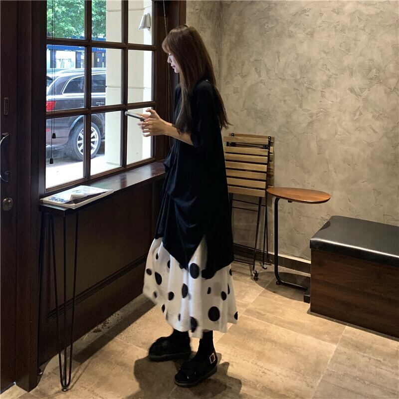色:黒いTシャツ,水玉スカート