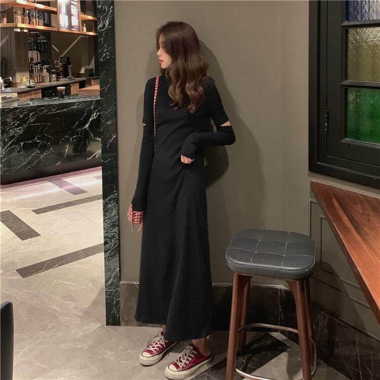 オータムAラインハイウェストウェスト薄手ソリッド カラーラウンドネックドレス ロング 秋物 Oネック ソリッドカラー misskkl6150919889